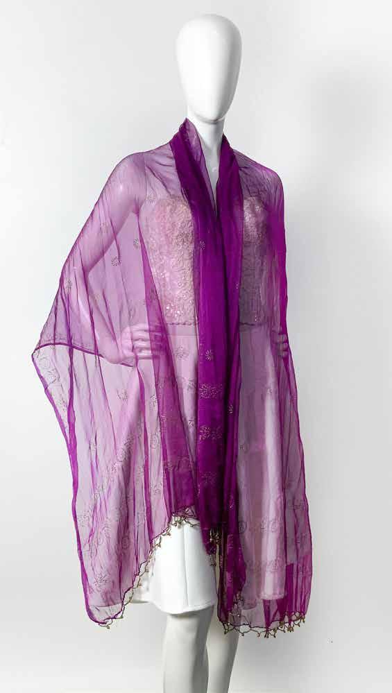 A dazzling beige mesh wrap with a scalloped trim, embellished with silver-toned sequins. All measurements are approximate.