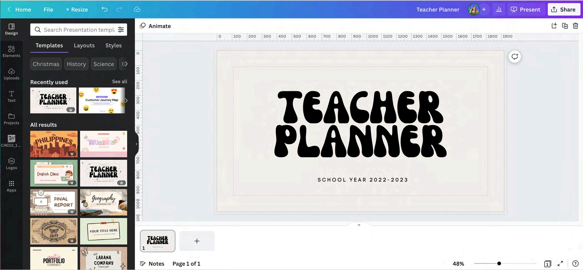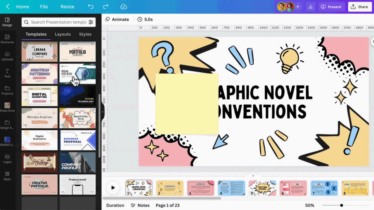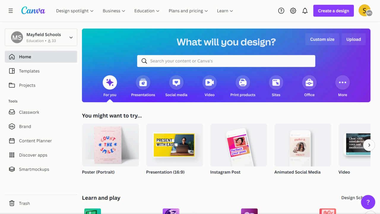 The 'Design' tab is where you will find everything you need to start designing right away from templates, layouts, and even styling right at your fingertips. Canva makes designing a breeze.