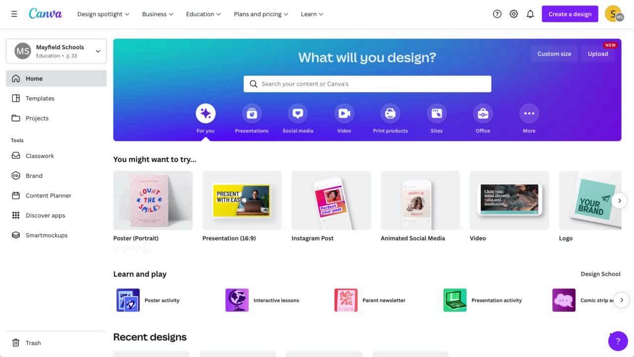 Find recommendations on what to try and your 'Recent designs'.