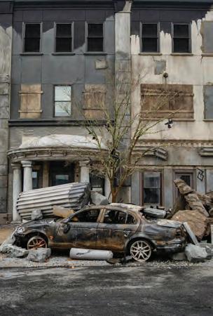 production designer Gemma Jackson adds. “Using diggers, they had to clear away huge amounts of concrete to allow them to lay down a foor of recreated cobble-set stones, which our very skilled team from Budapest had made by hand. Painting the set to get the colours correct, they then had to bring lorry loads of hard rubble, broken timbers, furniture and vehicles to dress it.”