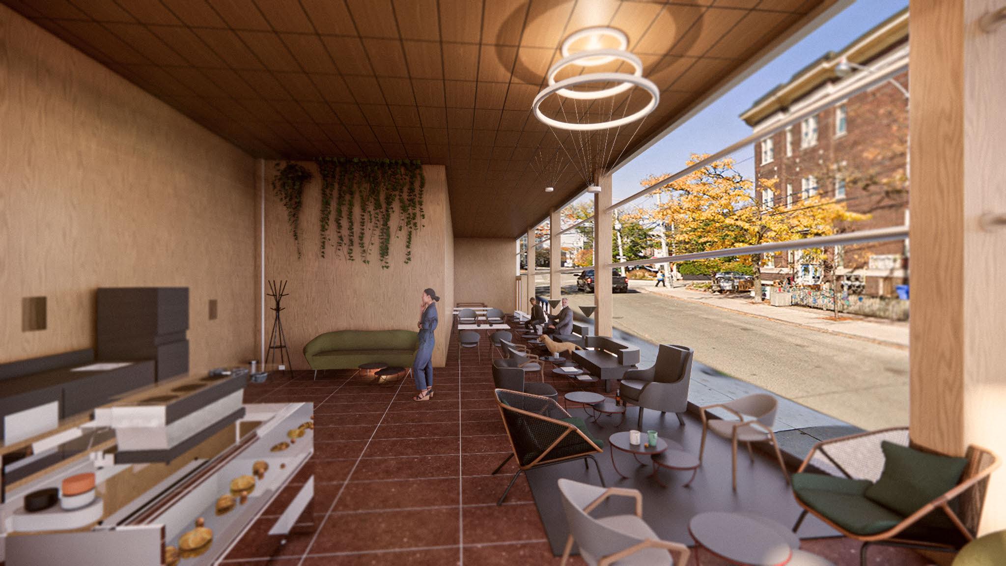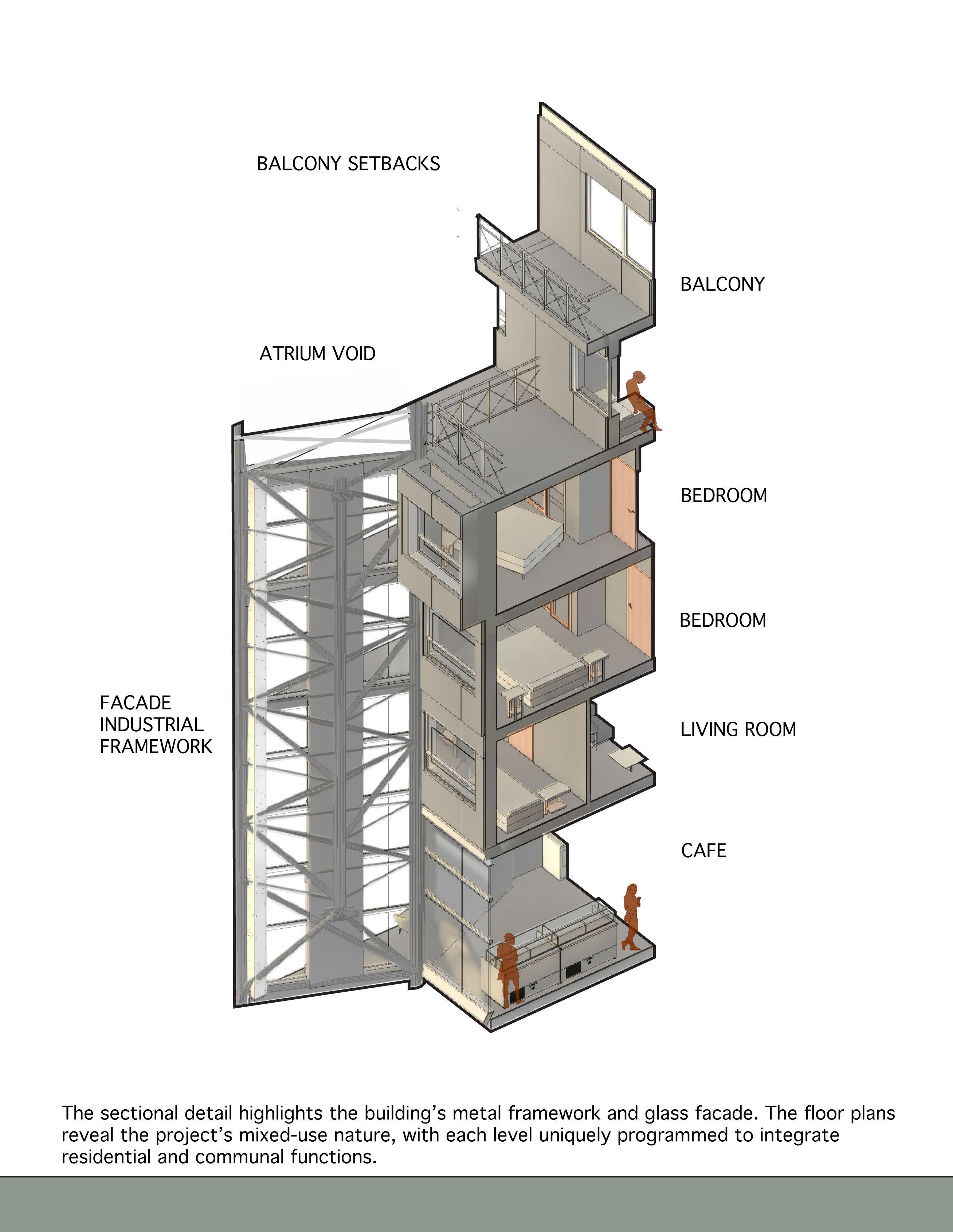 Active street-level retail, including a café that opens directly onto the sidewalk, terraces extend from the octagonal atrium, offering residents shared outdoor