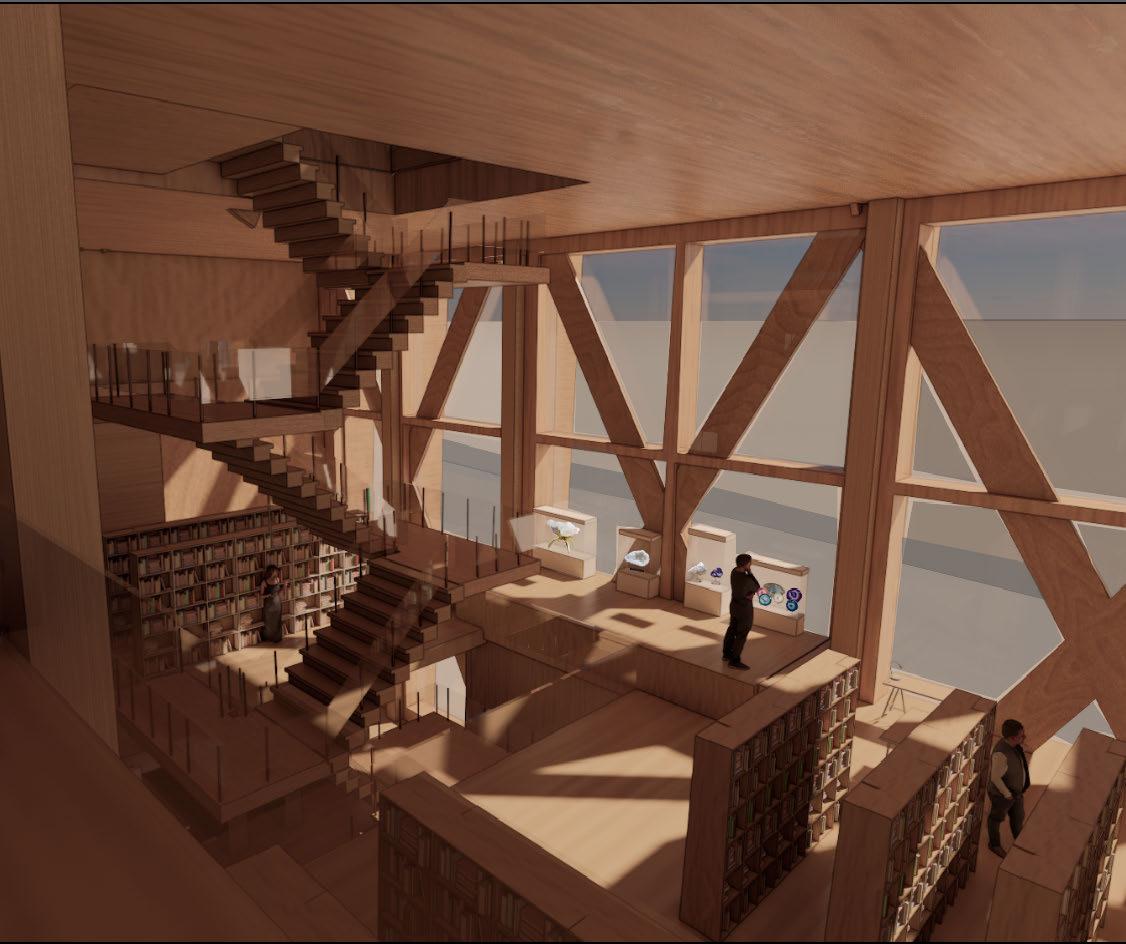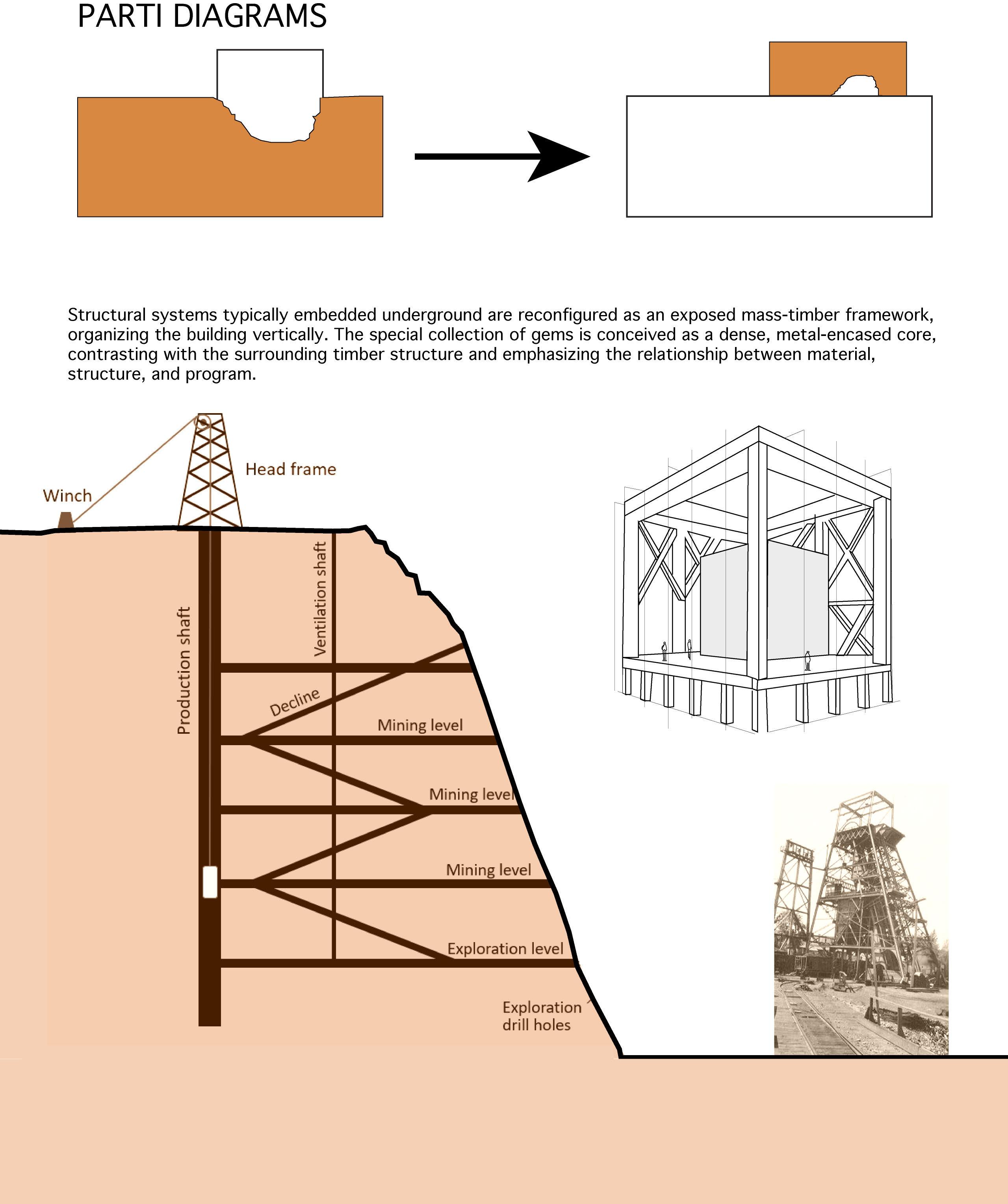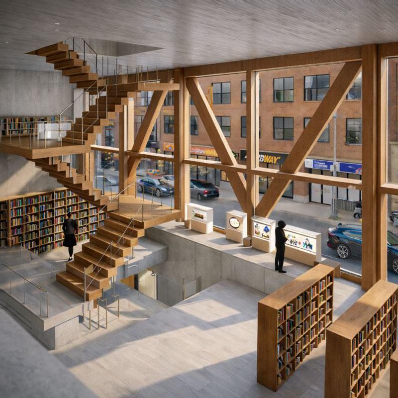 Set at Church Street and Adelaide, the project inverts the language of extraction, transforming underground geometries into a vertical, light-filled public space. Exposed mass-timber framing and cross-bracing translate the precision and rigor of mining infrastructure into an open architectural expression. By bringing this structure above ground, the library becomes a place of transparency, material clarity, and collective occupation. The act of excavation is reimagined as a spatial and civic experience.