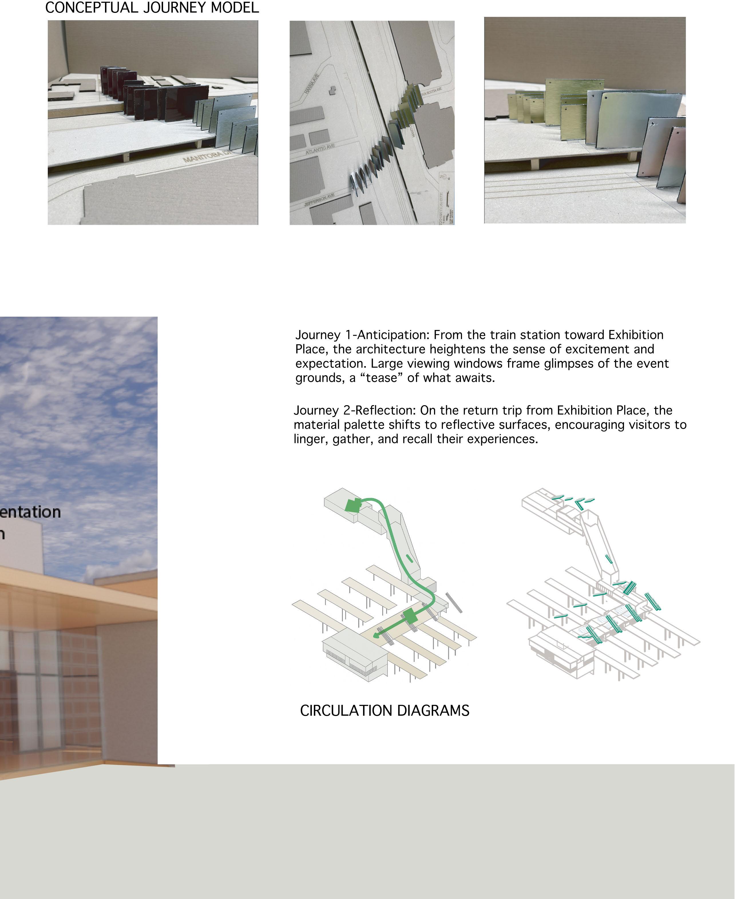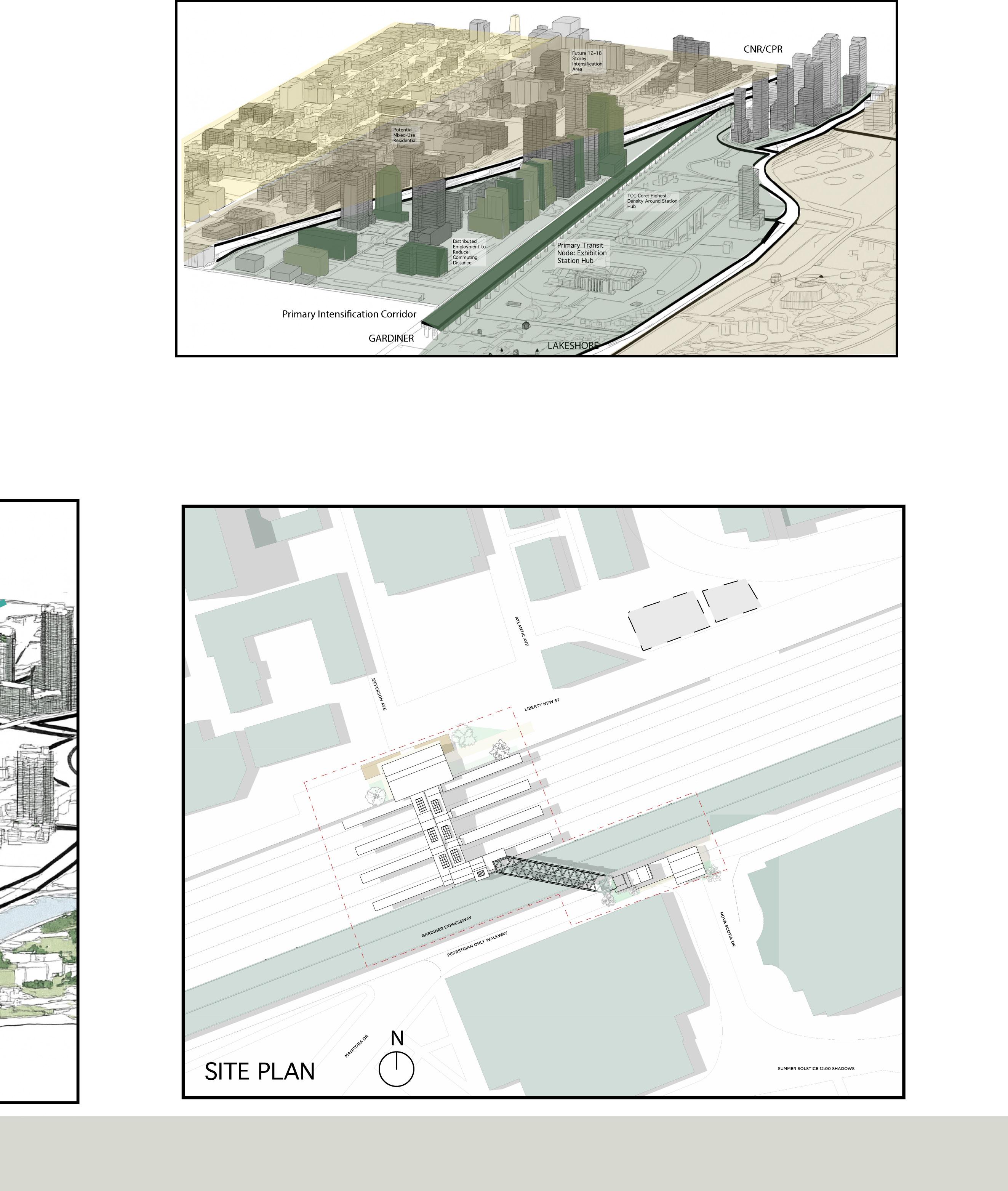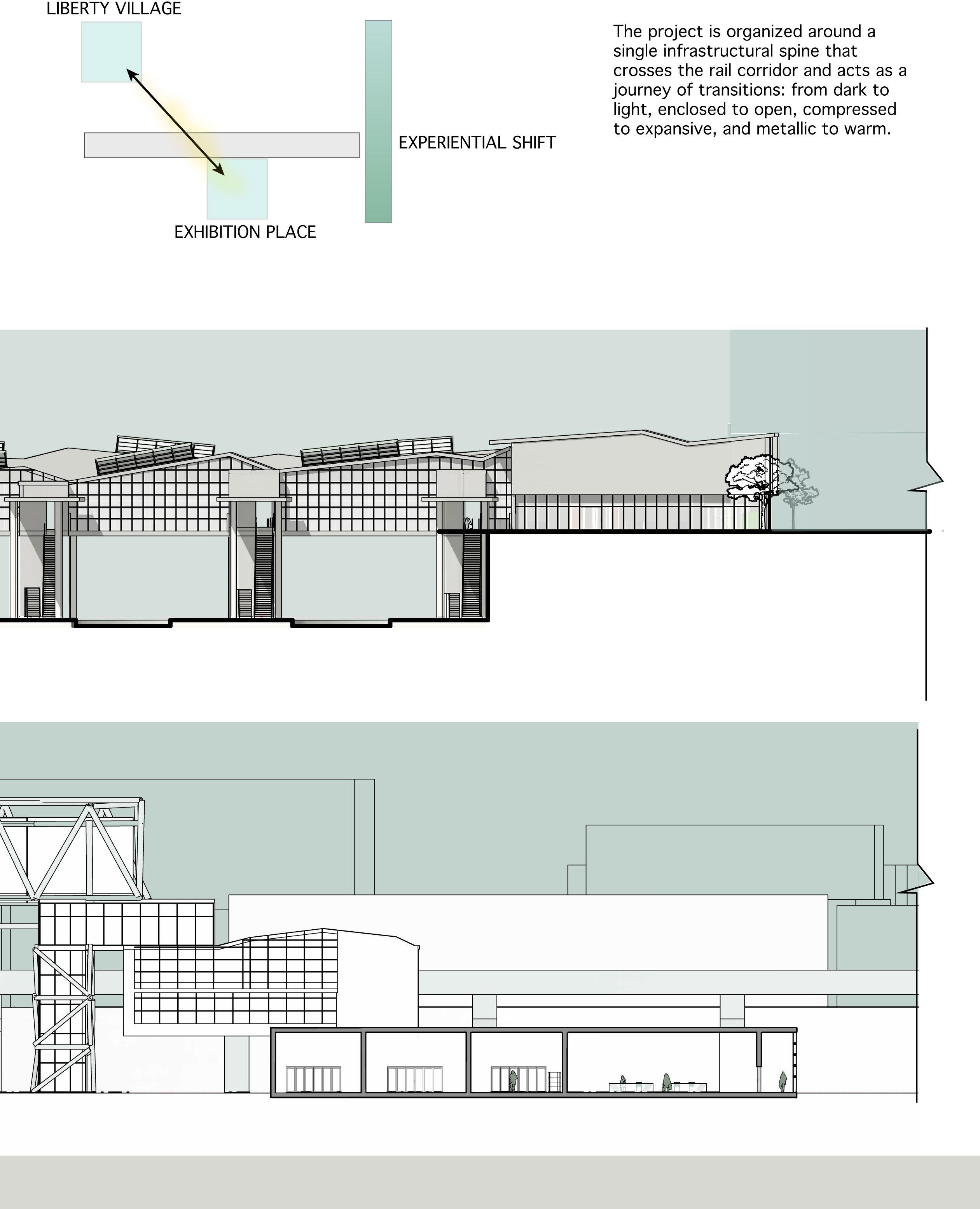 This project reimagines a transit hub as an architectural promenade, where circulation becomes a spatial and atmospheric experience rather than a purely functional conduit. Spanning rail lines and the Gardiner Expressway, the building operates as a connective threshold between Liberty Village and Exhibition Place.