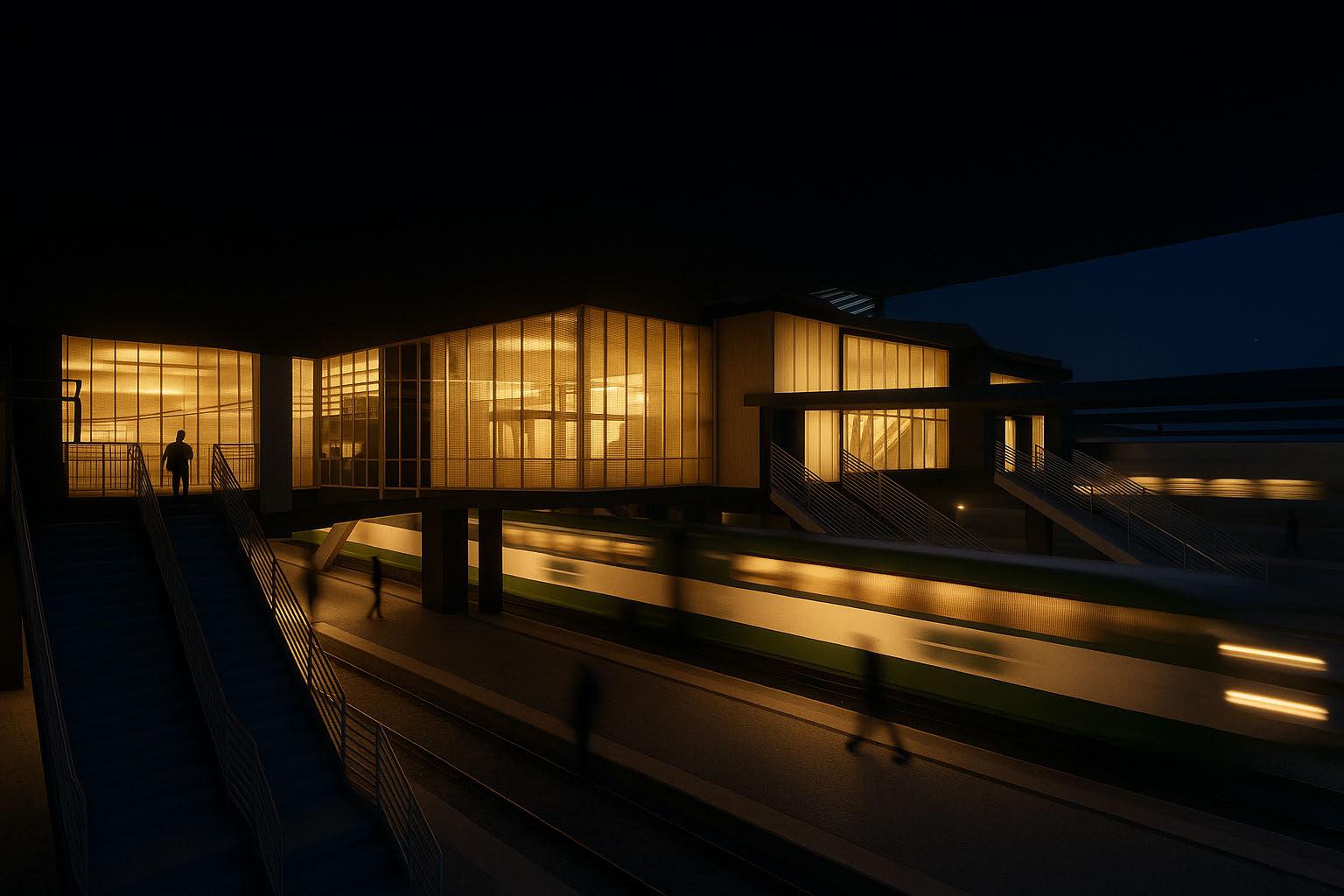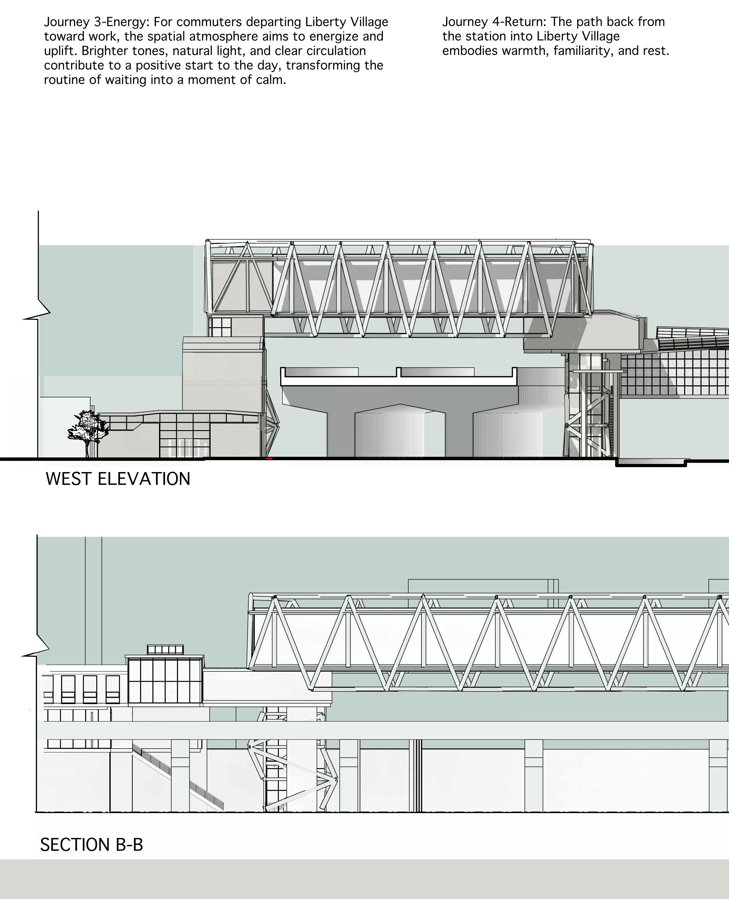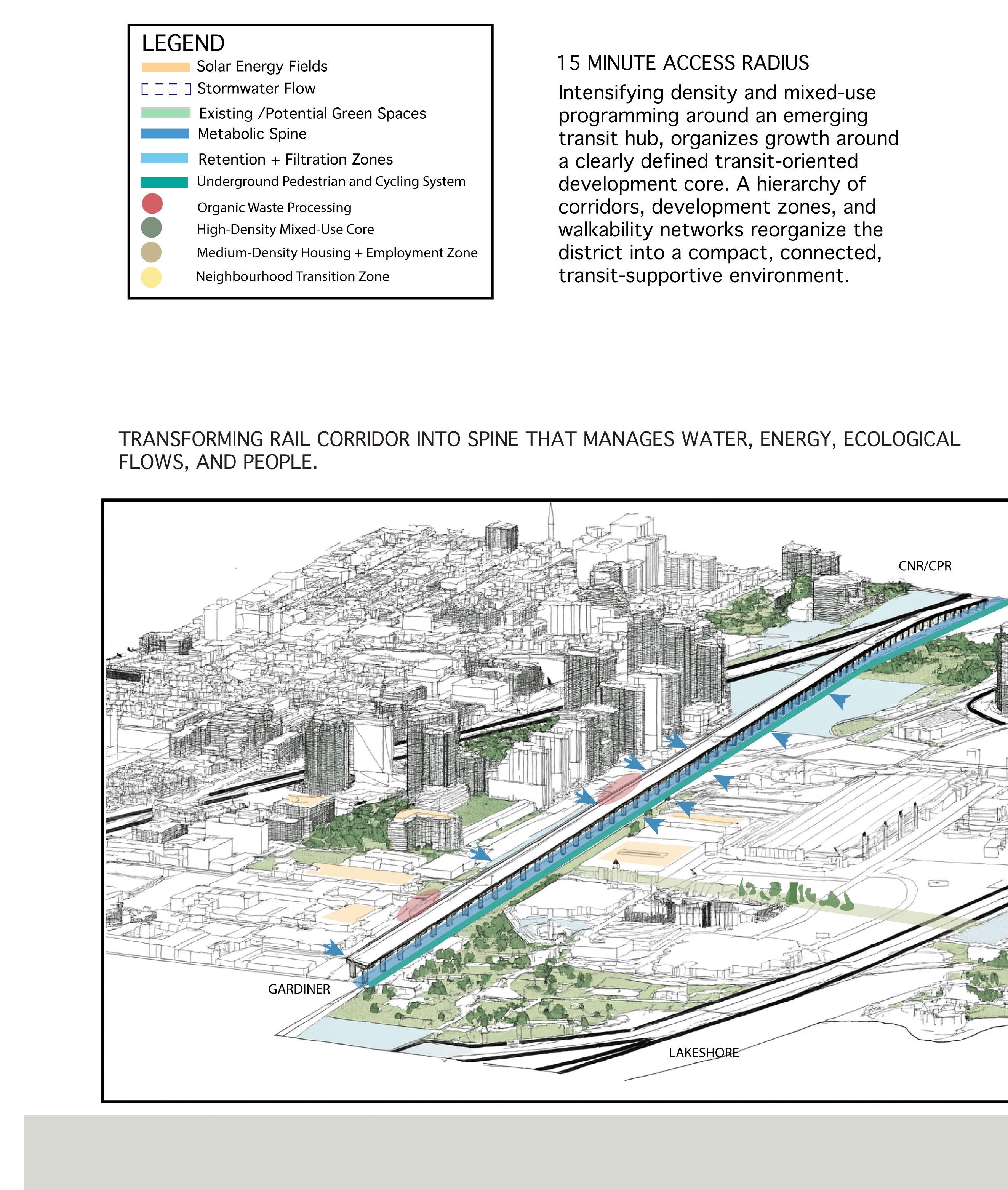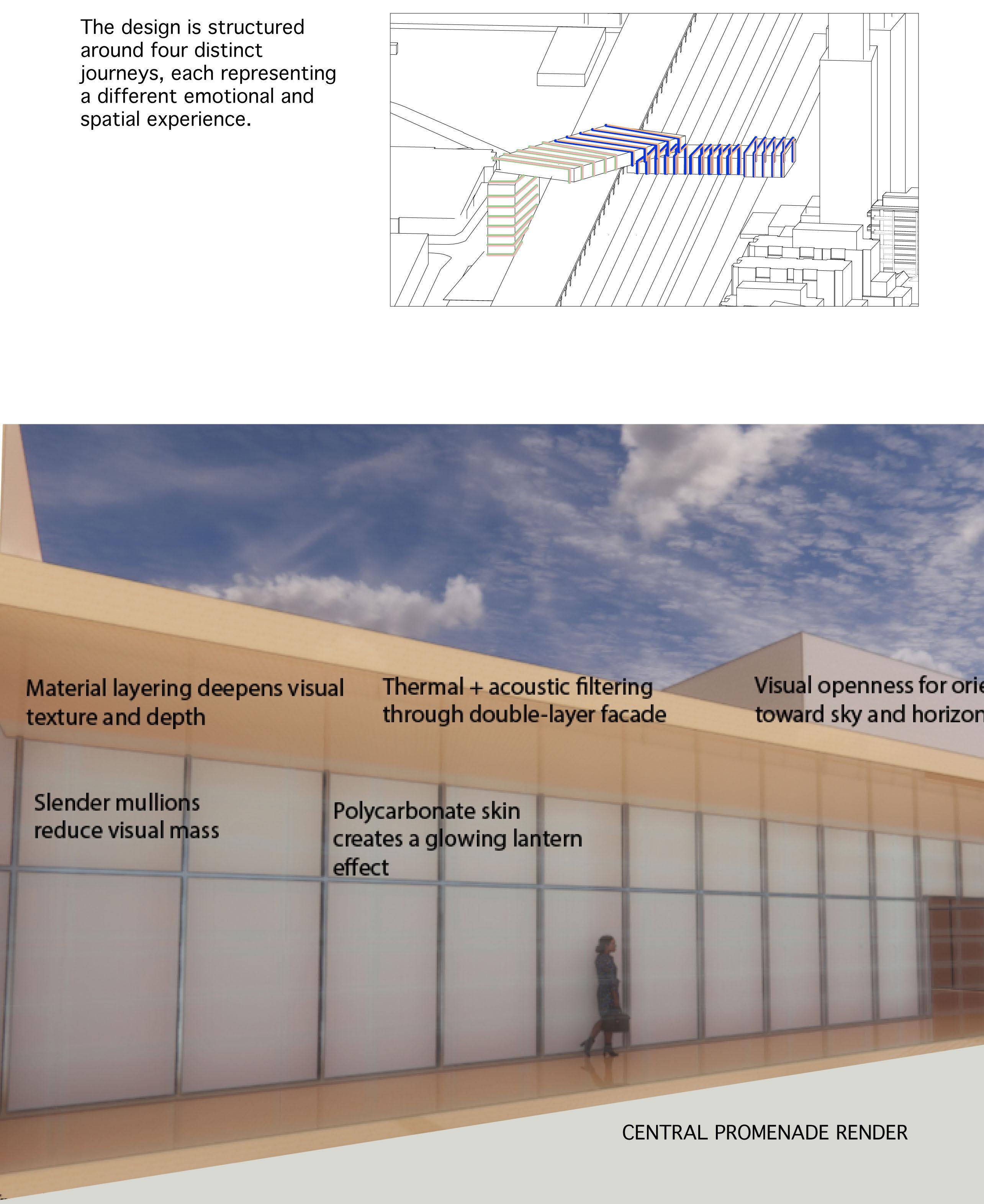 This project reimagines a transit hub as an architectural promenade, where circulation becomes a spatial and atmospheric experience rather than a purely functional conduit. Spanning rail lines and the Gardiner Expressway, the building operates as a connective threshold between Liberty Village and Exhibition Place.