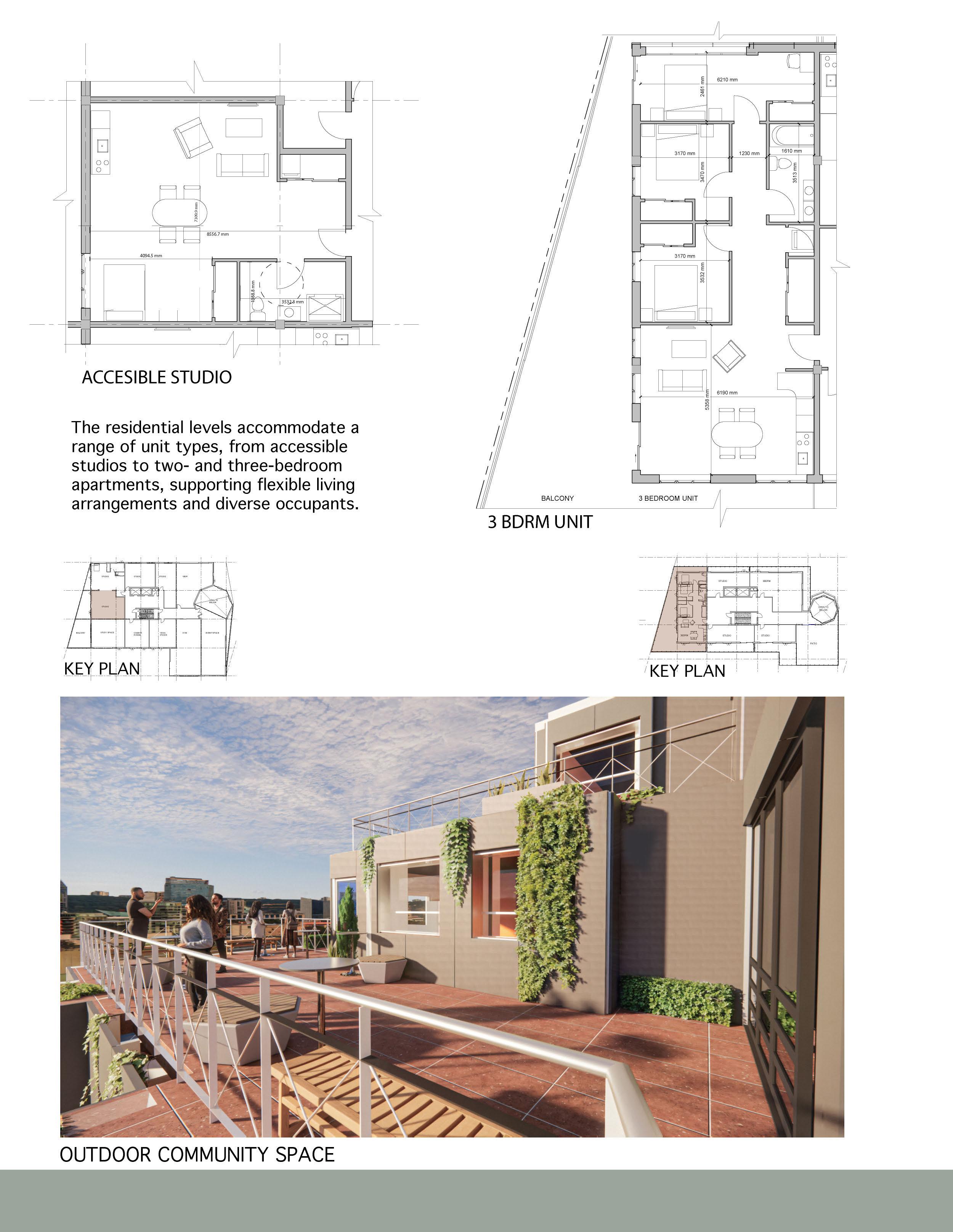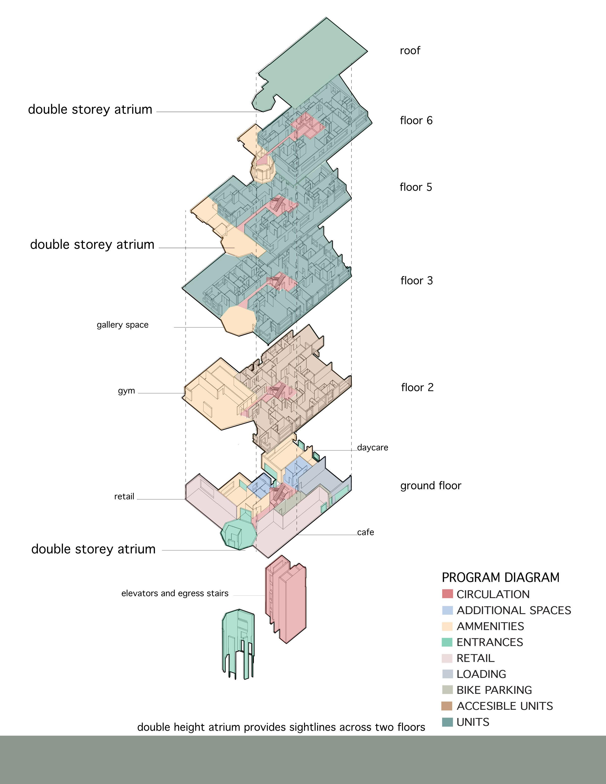 Located on Niagara Street near Stanley Park, Axis Eight is a mid-rise mixed-use project integrating retail and diverse residential units within an industrial-inspired framework. Drawing from the material and spatial language of nearby factories, the design centers on an octagonal atrium that organizes circulation, brings light deep into the building, and connects shared amenities and housing through a transparent street-facing facade.