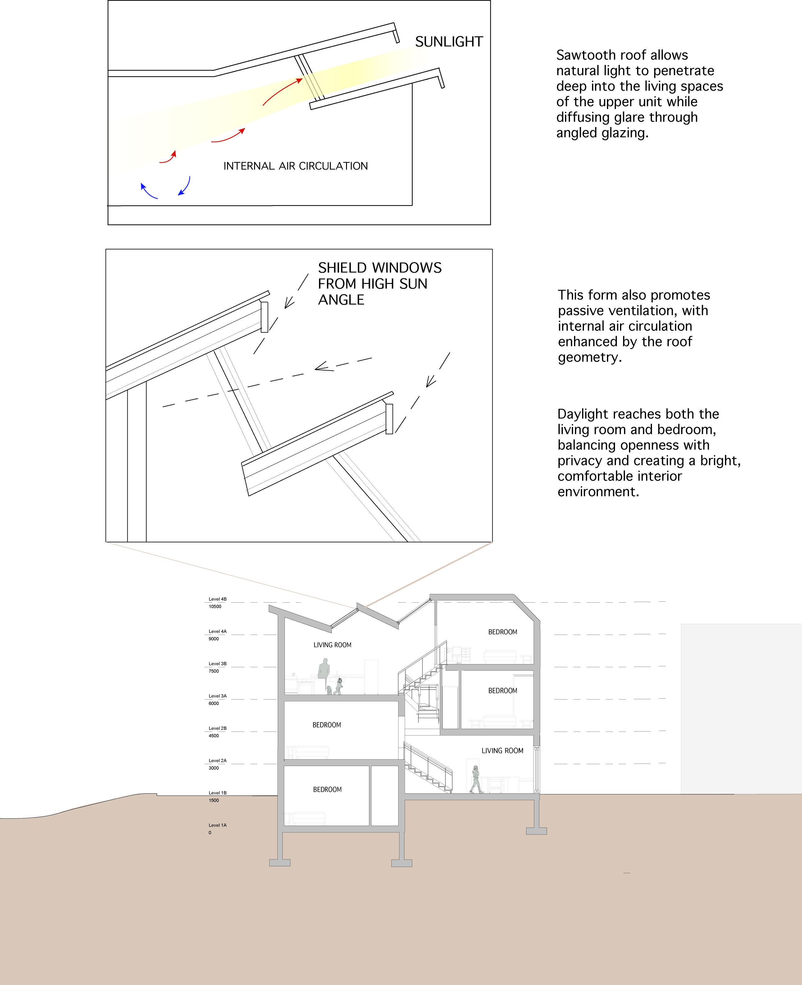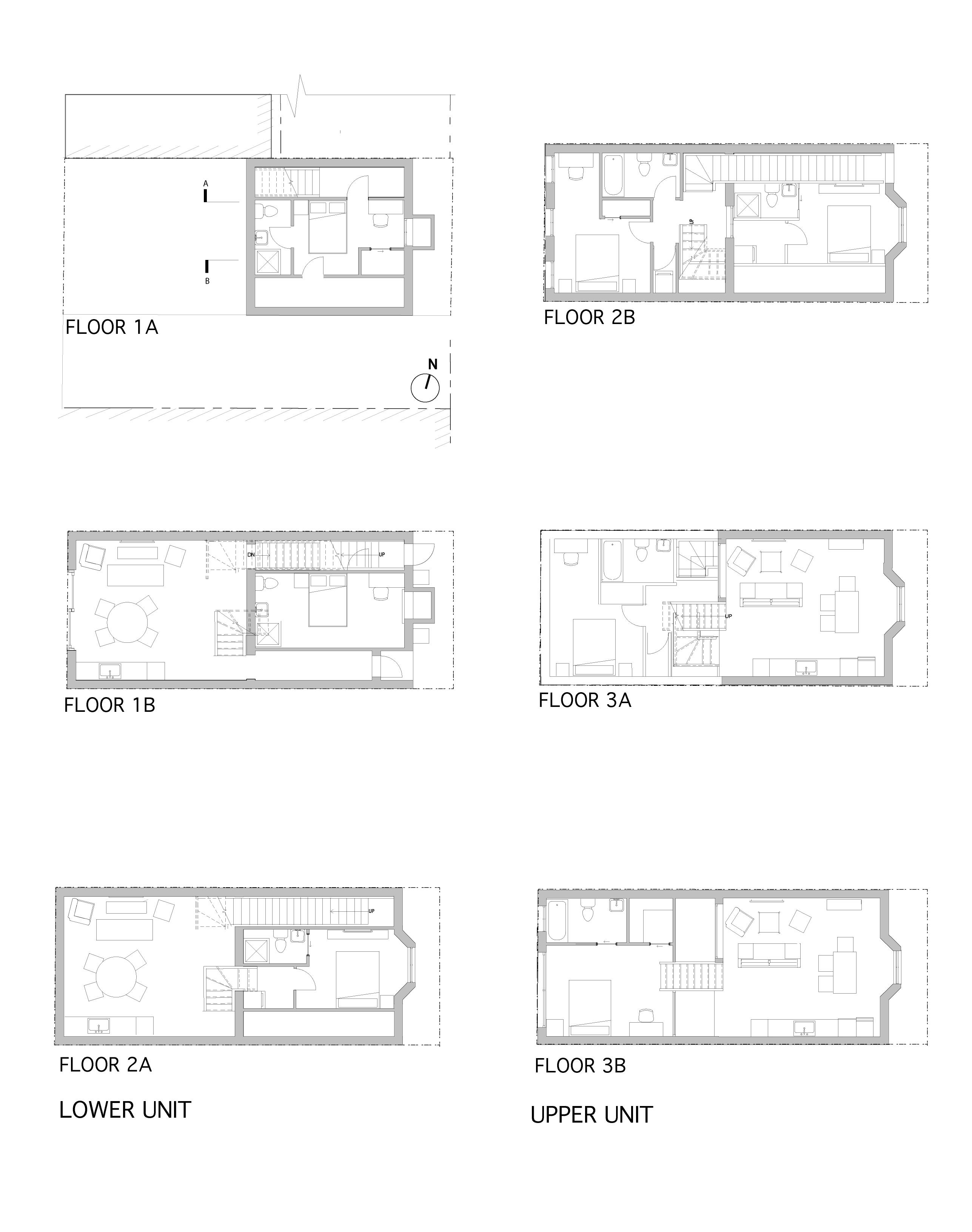 Located along the edges of Stanley Park, this project explores vertical living through a laneway duplex composed of two distinct three-storey units. Each residence interlocks across staggered floor levels, creating dynamic sectional relationships and spatial variety within a compact urban footprint. The design emphasizes privacy, daylight, and circulation.