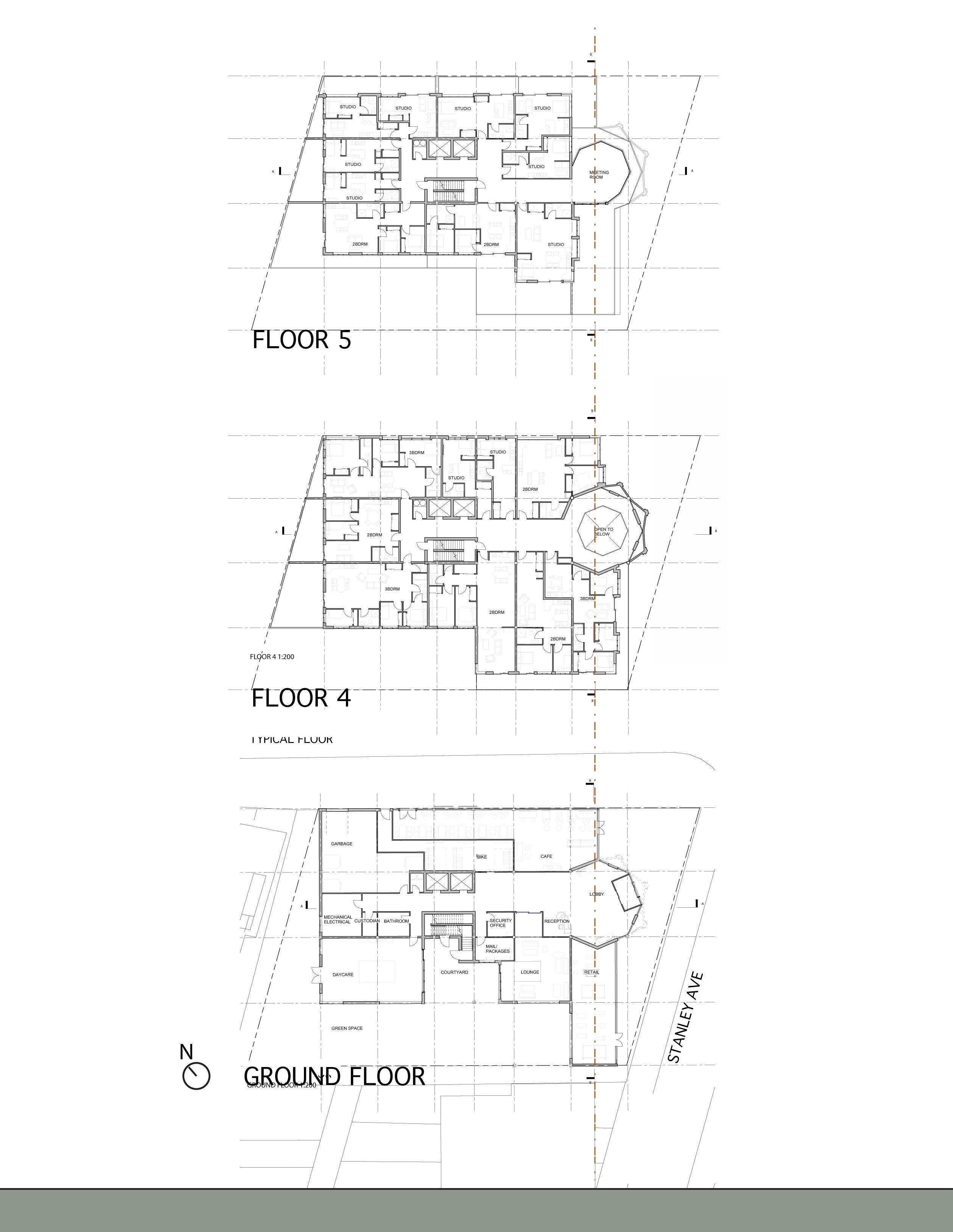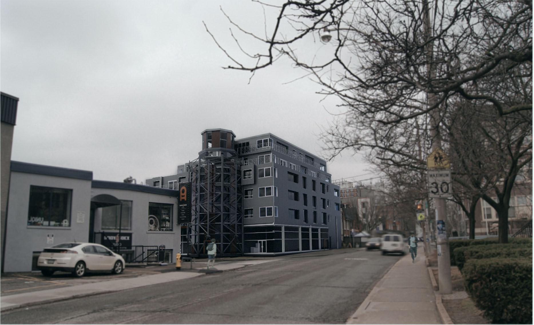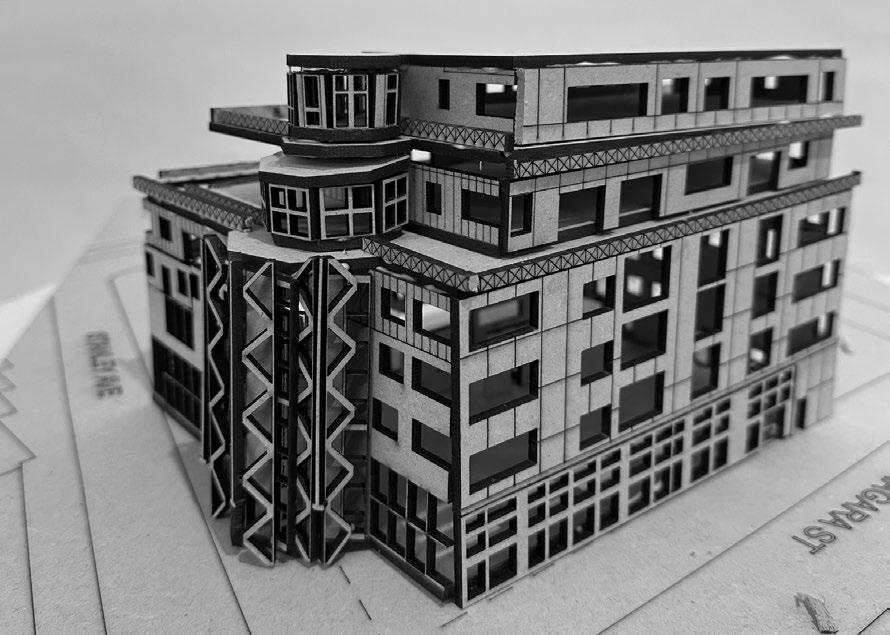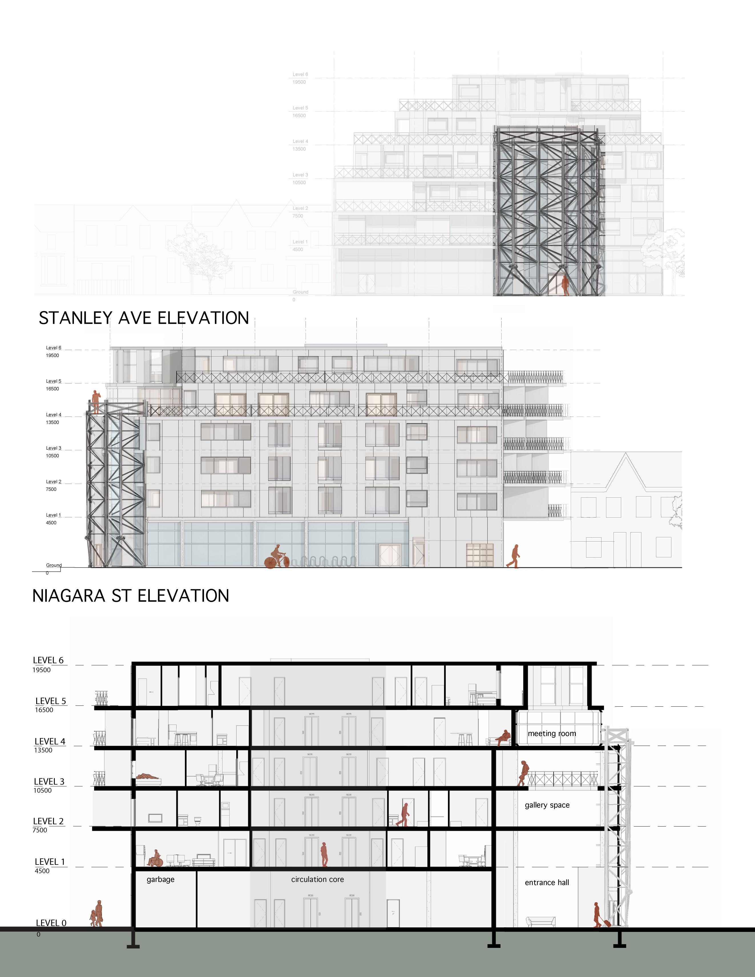 sidewalk, fosters public engagement along Niagara Street. Above, private communal spaces with views of the city.
