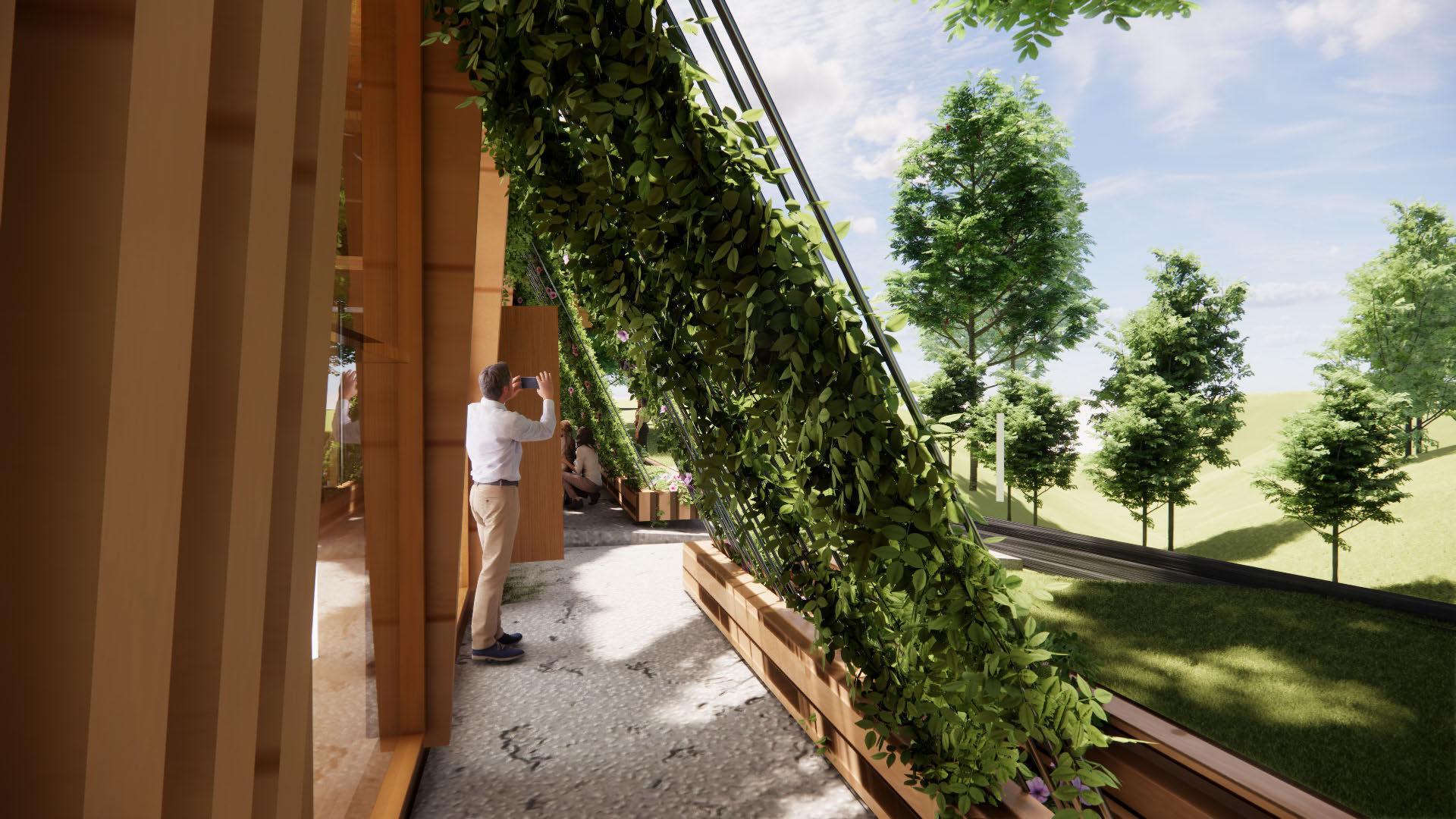 Enclosed galleries frame controlled views into the canopy while maintaining visual separation between visitors and habitat.