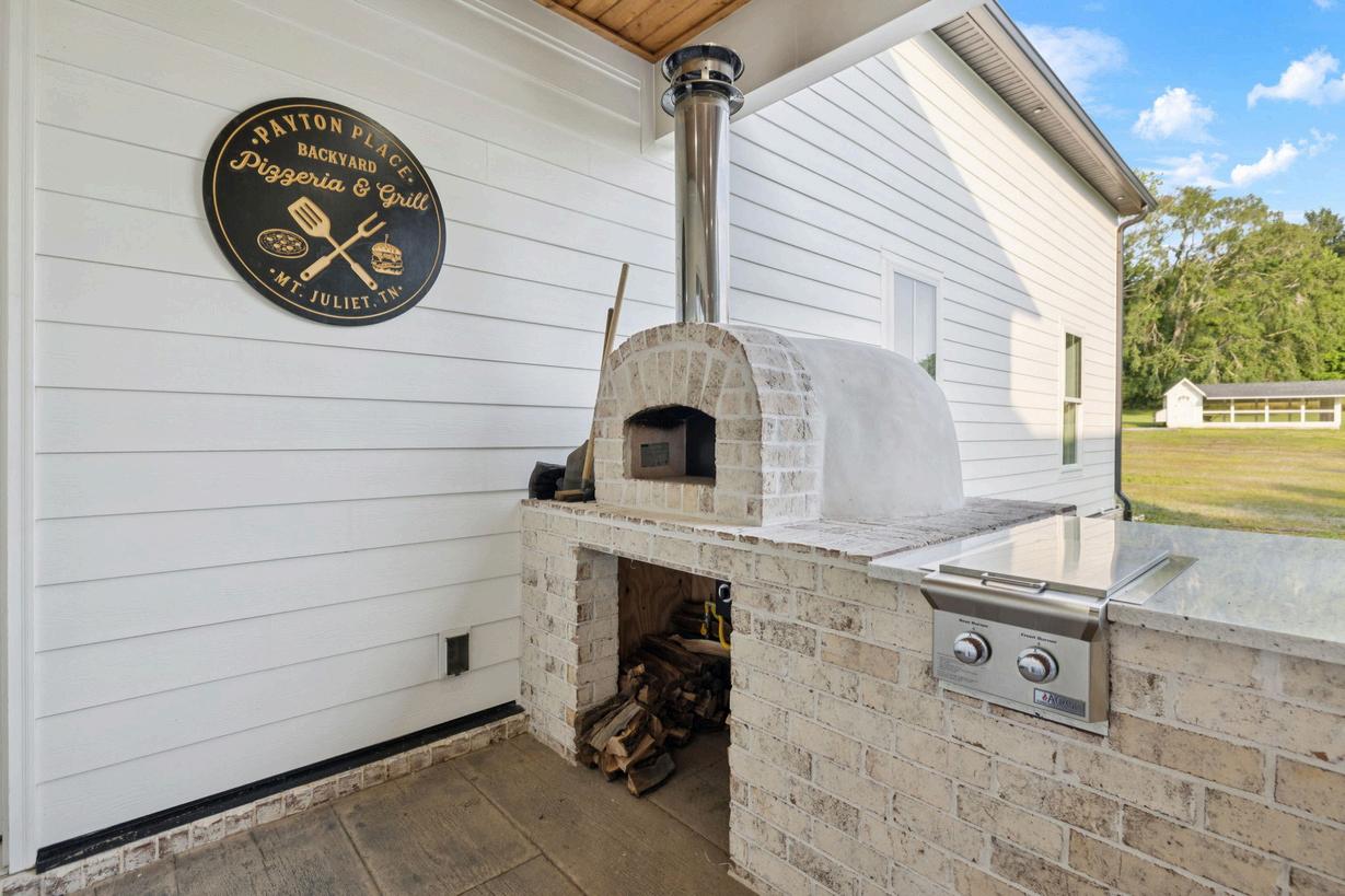 Surrounded by natural beauty and total privacy, the grounds offer a resort-worthy experience at every turn The backyard is a destination of its own an outdoor paradise crafted for cooking, entertaining, and unwinding beneath the open sky At the heart of it all, a fully equipped custom outdoor kitchen invites you to savor every season. Whether you're crisping a Neapolitan-style pizza in the wood-fired oven, firing up the built-in gas grill, or slow-cooking over the Primo Egg, this space blends function with finesse Granite countertops gleam beneath the soft glow of recessed lighting, while a commercial-grade mini fridge and ice maker ensure everything you need is always within reach Evenings unfold beside the whitewashed brick fireplace, where flames flicker and stories linger.