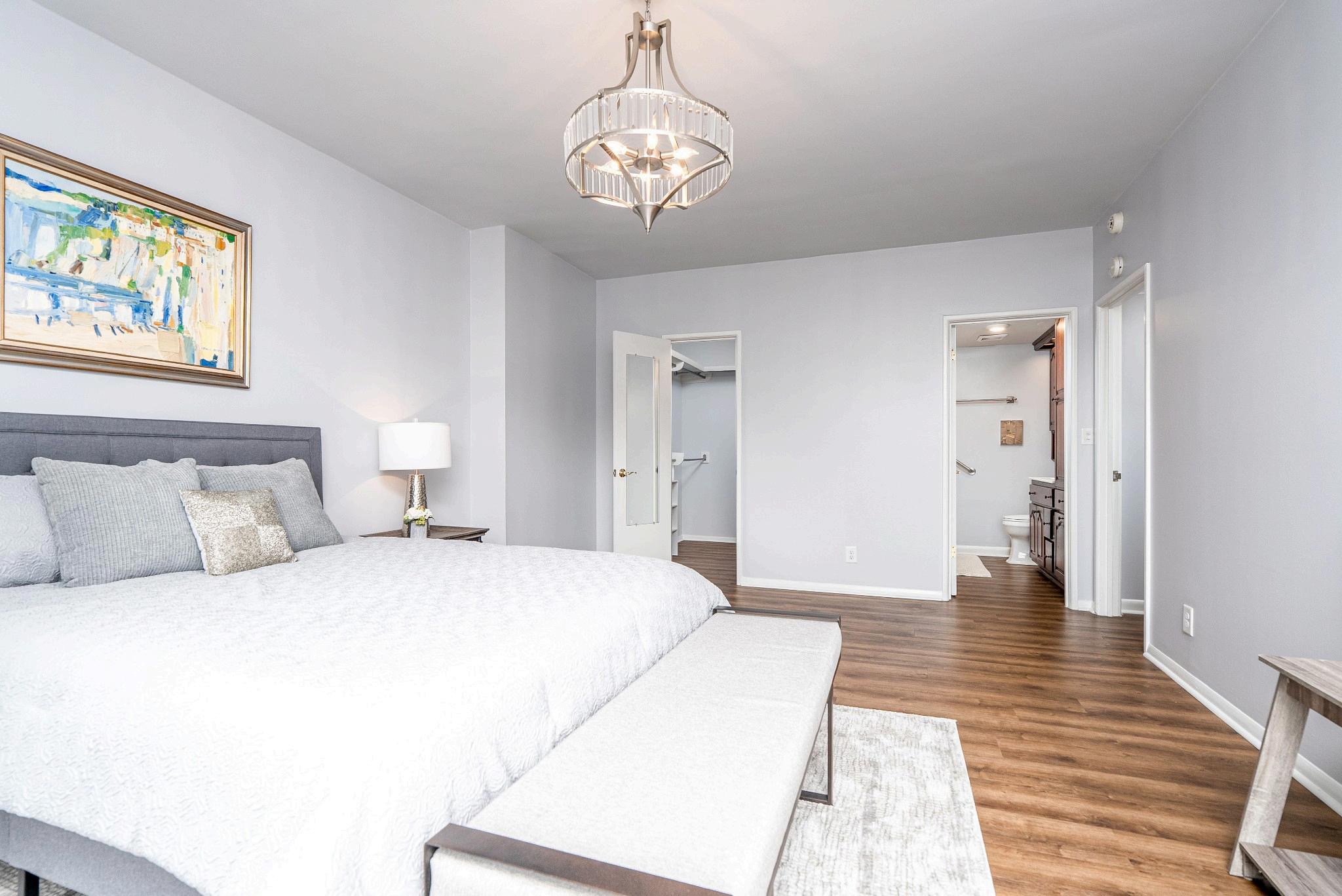 The primary bedroom is a serene retreat, thoughtfully designed with proportions that balance elegance and functionality The space accommodates a full bedroom suite while maintaining an open, airy layout, enhanced by large windows that fill the room with natural light and showcase the west-facing views Additional closet space provides ample storage while keeping the room uncluttered and refined. The adjoining primary bathroom features a clean, modern layout with updated finishes, a generous vanity, and carefully considered design details that create a seamless flow between the bedroom and bath