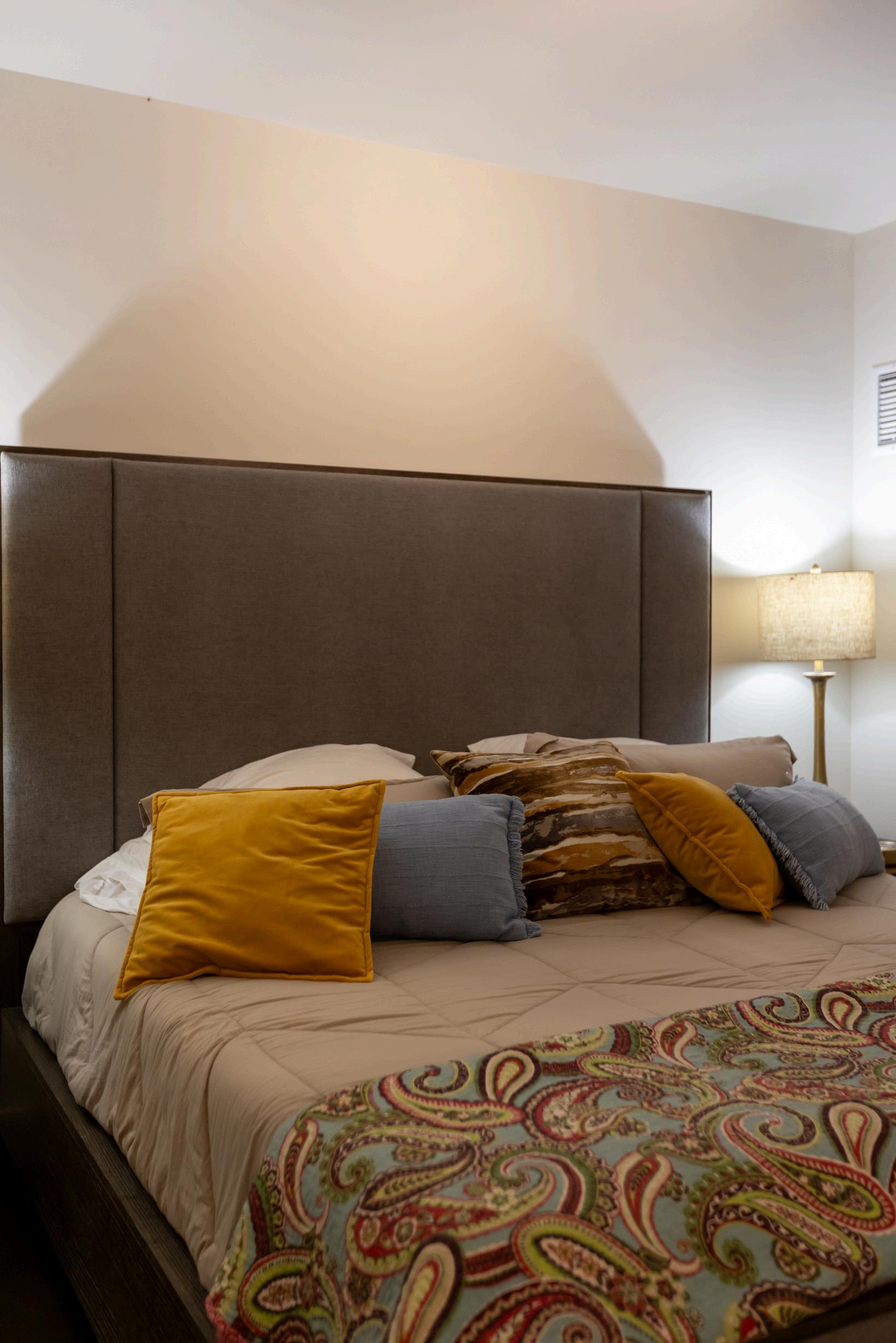 Bathed in natural light, the primary bedroom is a tranquil sanctuary where space and elegance come together effortlessly Expansive windows frame serene views while filling the room with a warm, inviting glow The layout accommodates a full bedroom suite with ease, maintaining an open, airy atmosphere that feels both refined and restorative. The adjoining bathroom continues the sense of calm, featuring modern finishes, a generous vanity, and thoughtfully curated details that create a seamless, polished retreat from the day.