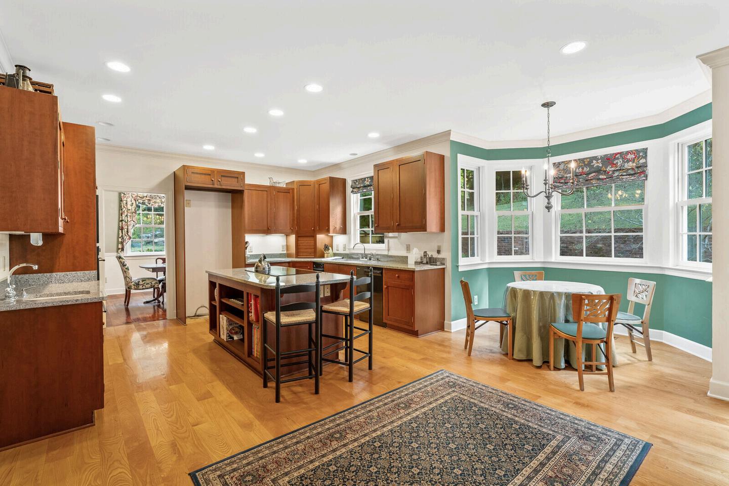 Just off the kitchen, a character-rich informal sitting area awaits. Abundant natural light floods the space, drawing you past a charming breakfast nook and into the true heart of the home. Here, the kitchen shines with two sinks, a large island with seating, and a vast prep space for entertainers and culinary enthusiasts alike Around the corner sits the formal dining room Rest assured that gatherings are made easy in this home, no matter the occasion