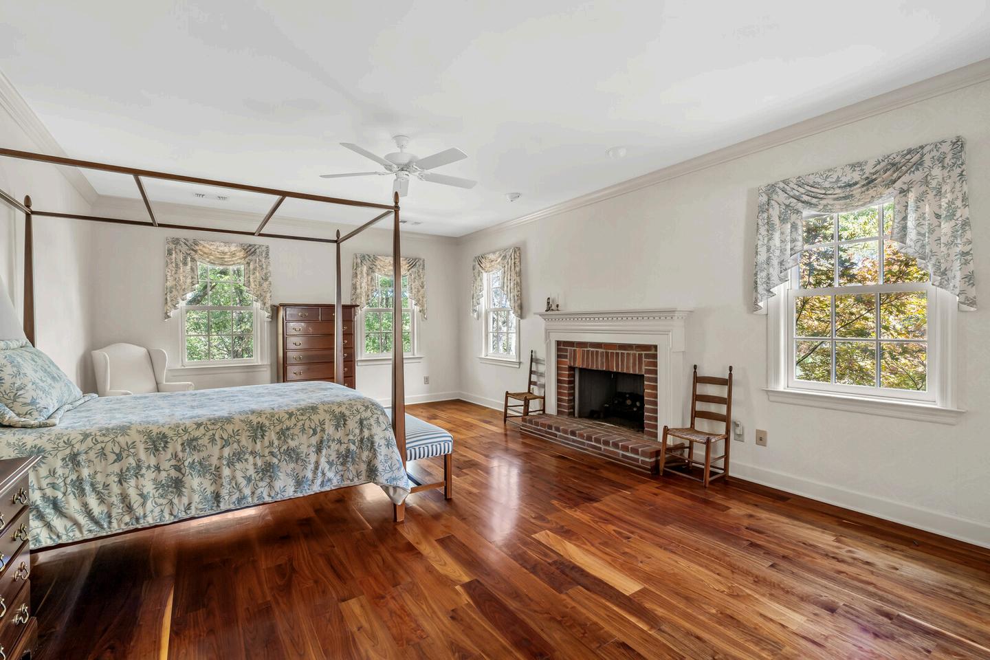 Walnut hardwood flooring is carried upst primary suite, where an understated fi endless potential await. The adjoinin bathroom boasts the ideal mixture of col with modern amenities like a soaking tu shower, and dual vanities