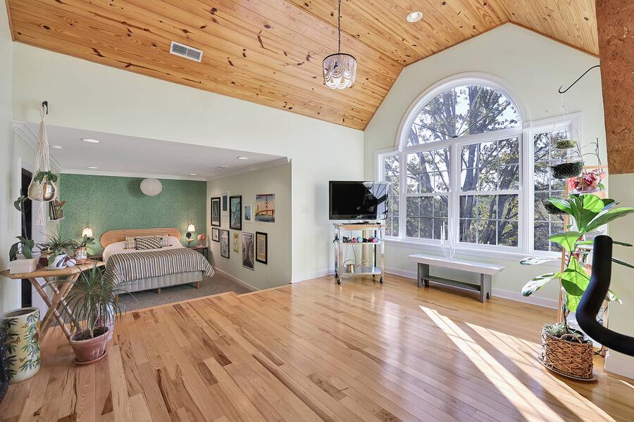 Upstairs, you will find an expansive bedroom featuring gorgeous wood accents and natural light that floods the room.