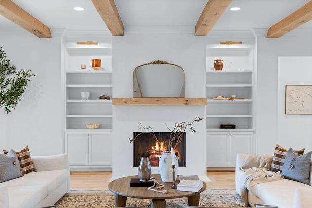 Open living area with fireplace, custom cabinetry, and exposed beams