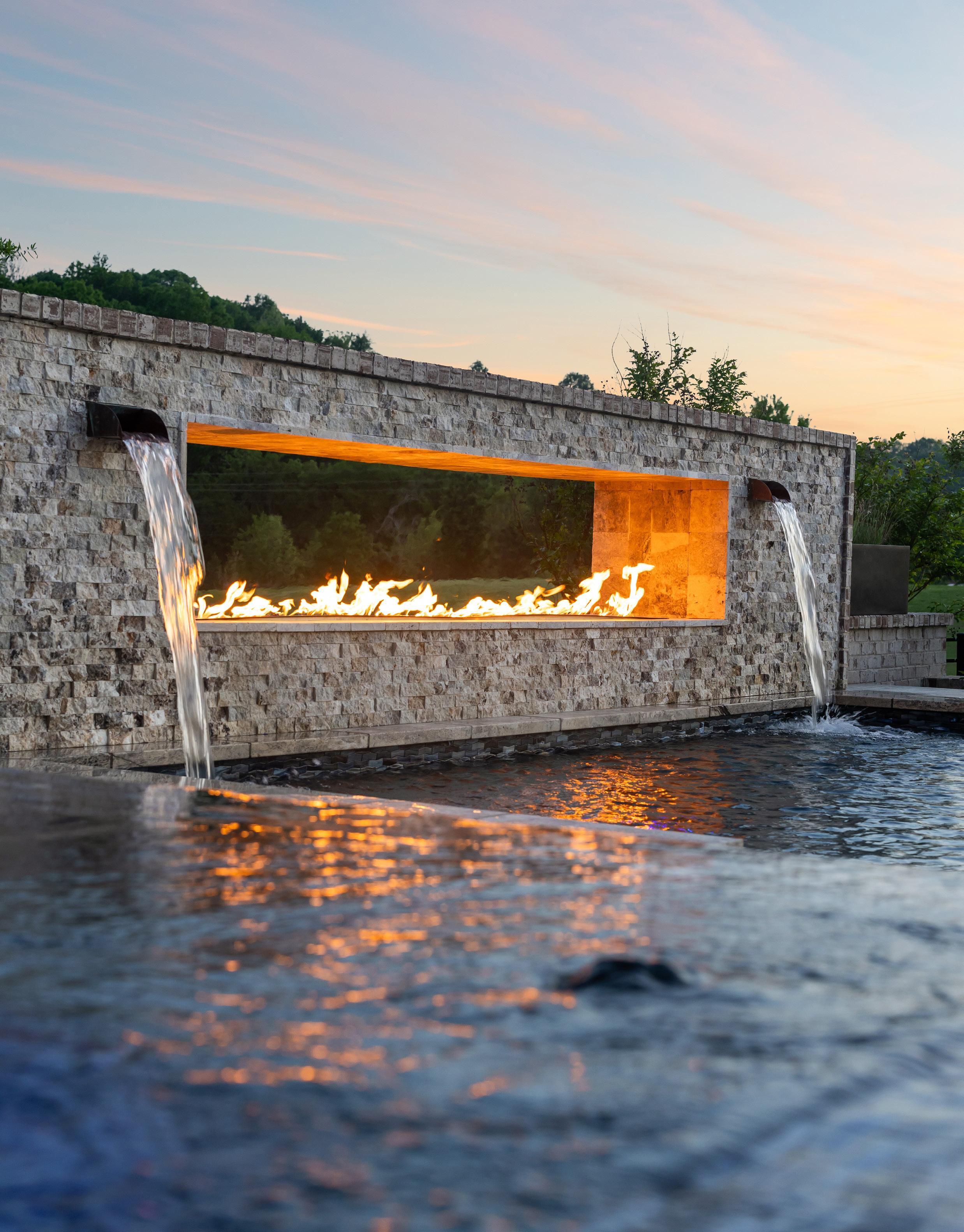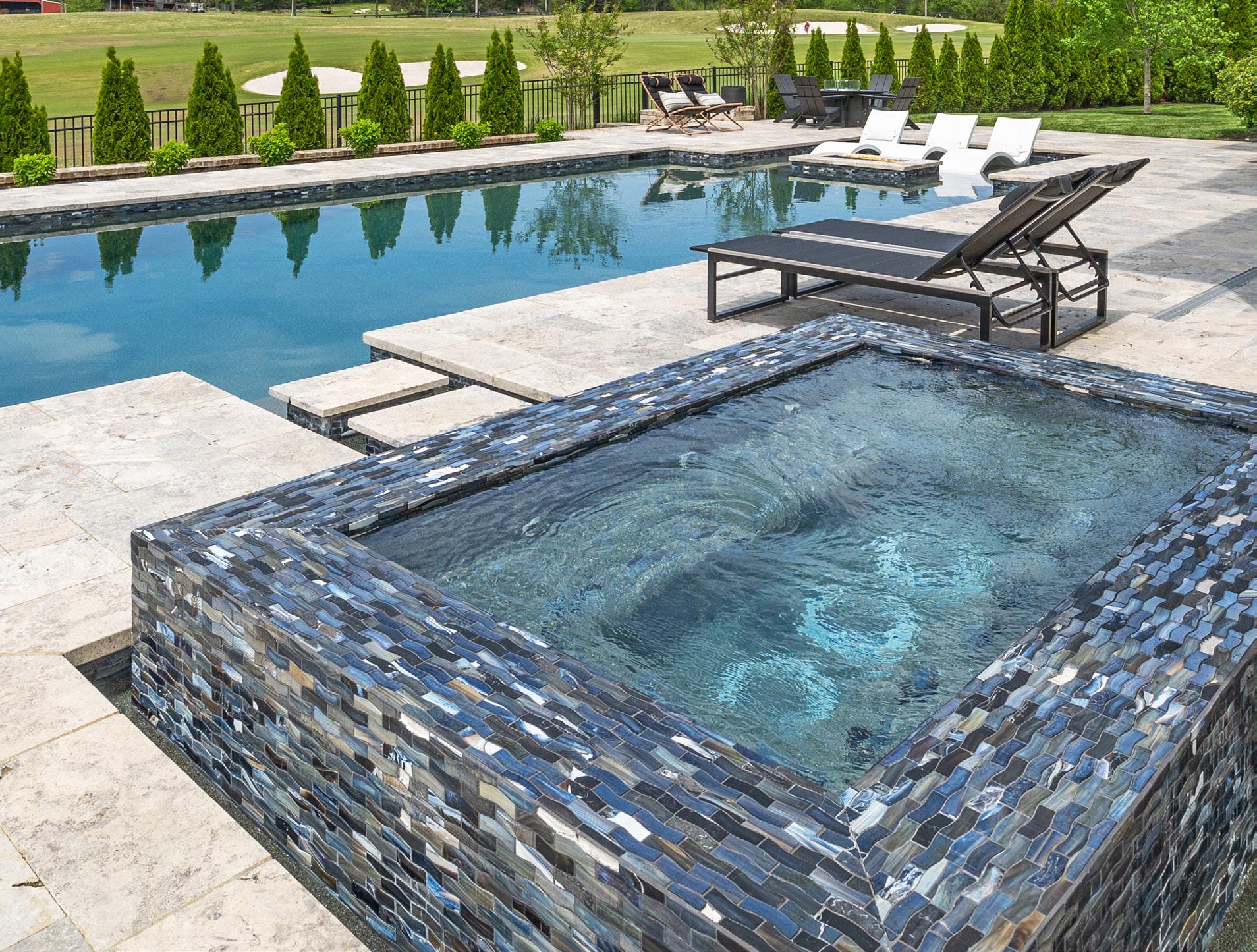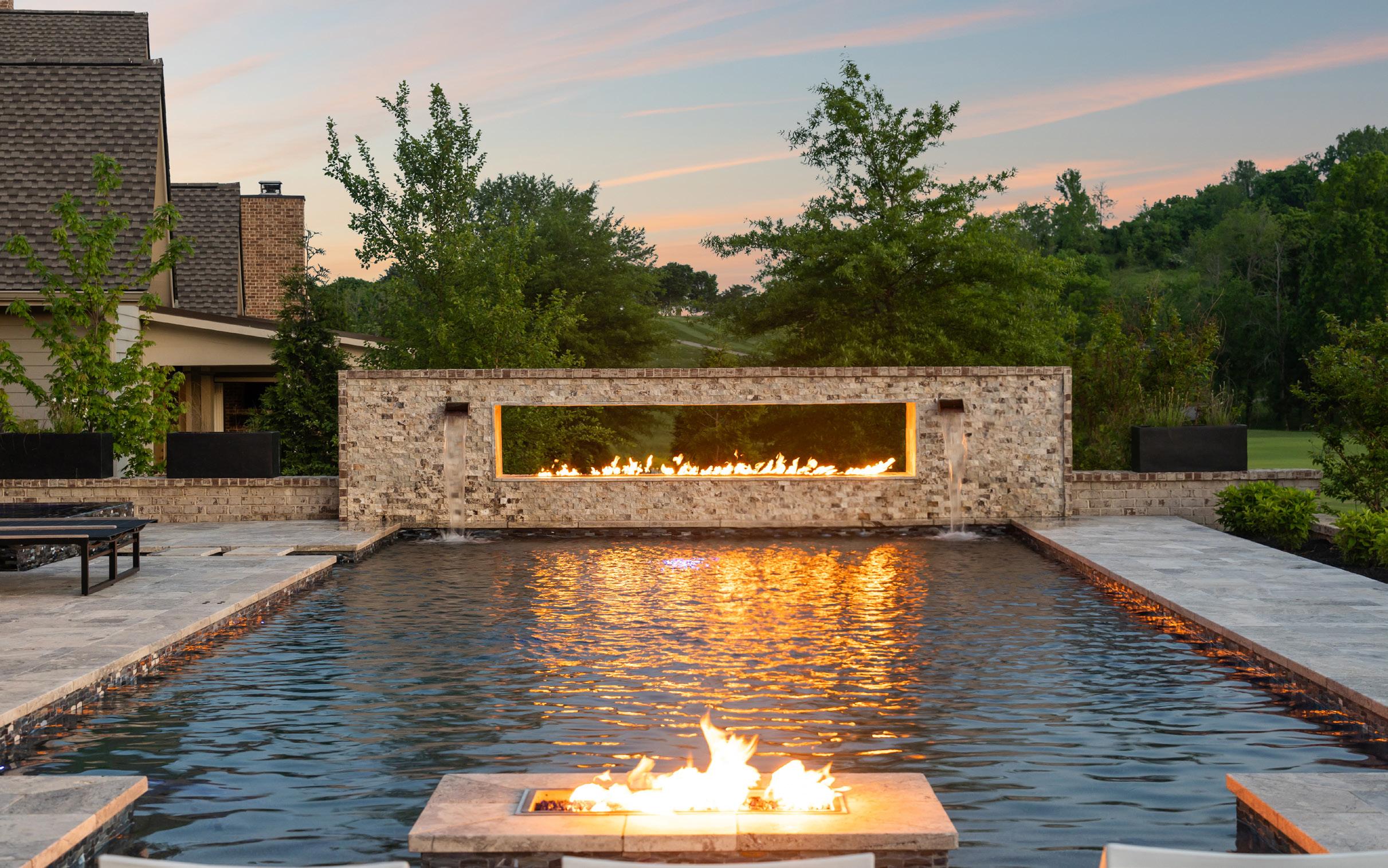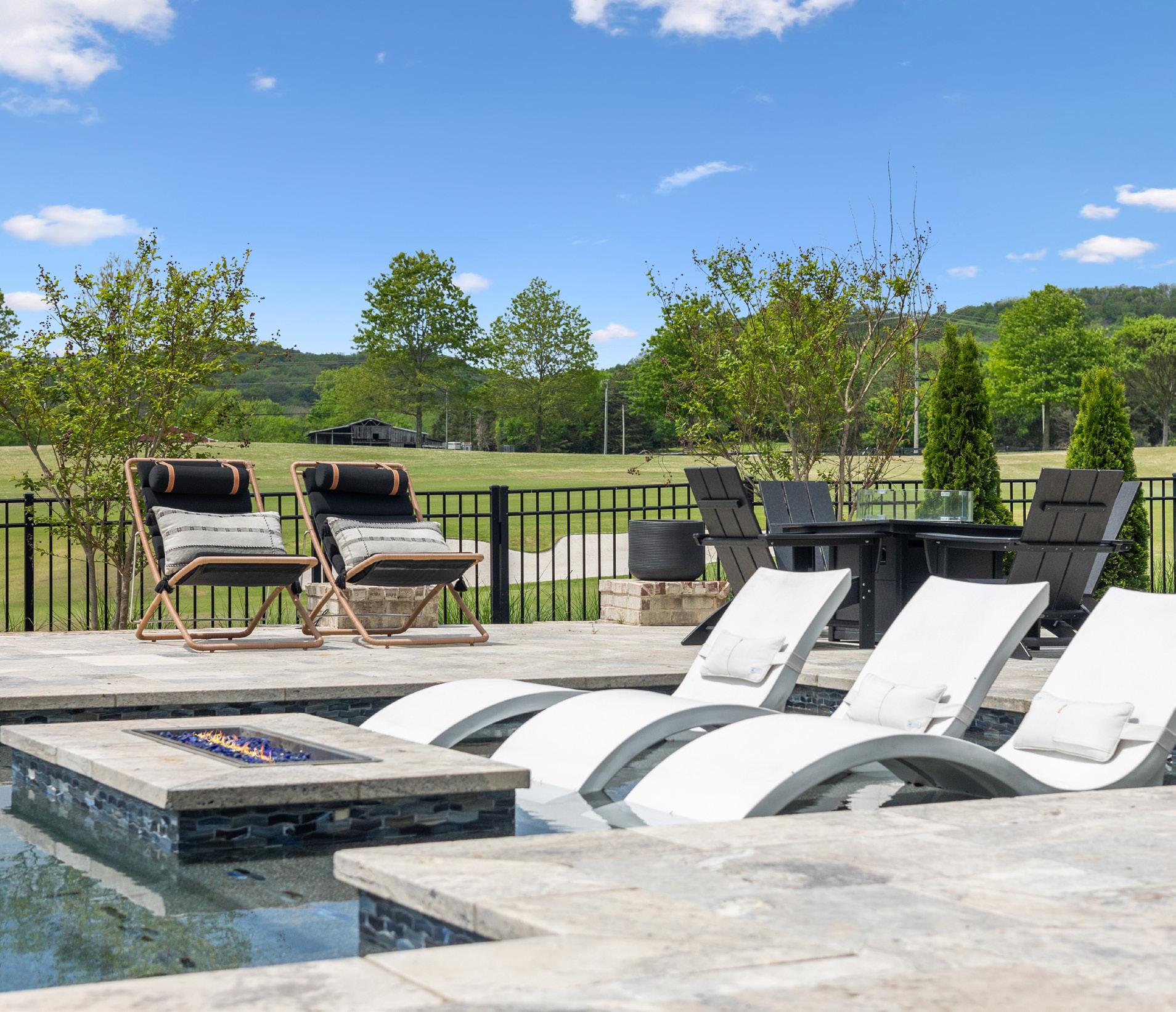 The outdoor space is an entertainer’s dream with a screened porch featuring retractable screens, a built-in outdoor kitchen, a pool with a sun shelf, a tiled spa, a fire pit, and a fenced yard, all backing onto the prestigious Grove golf course.