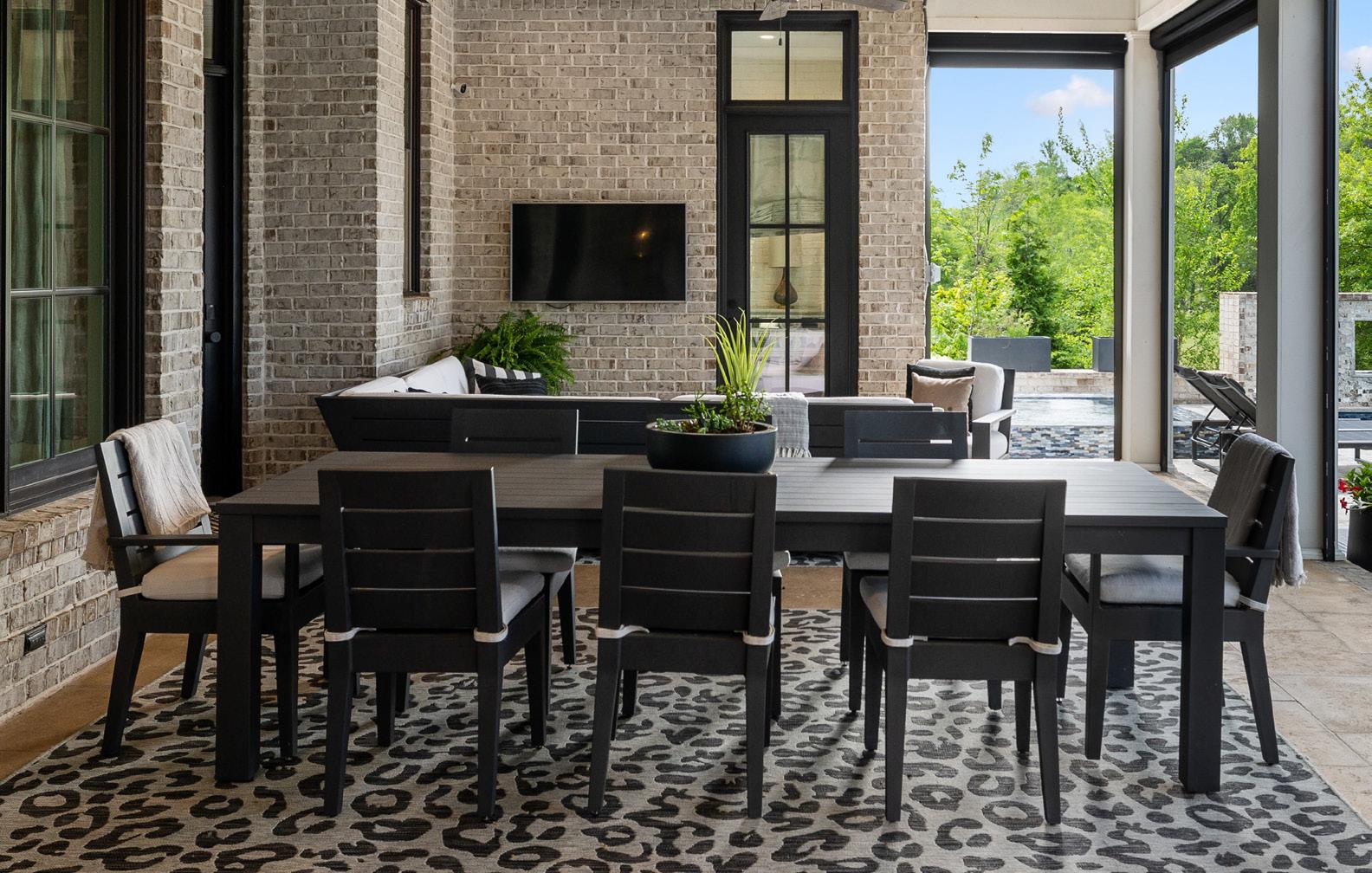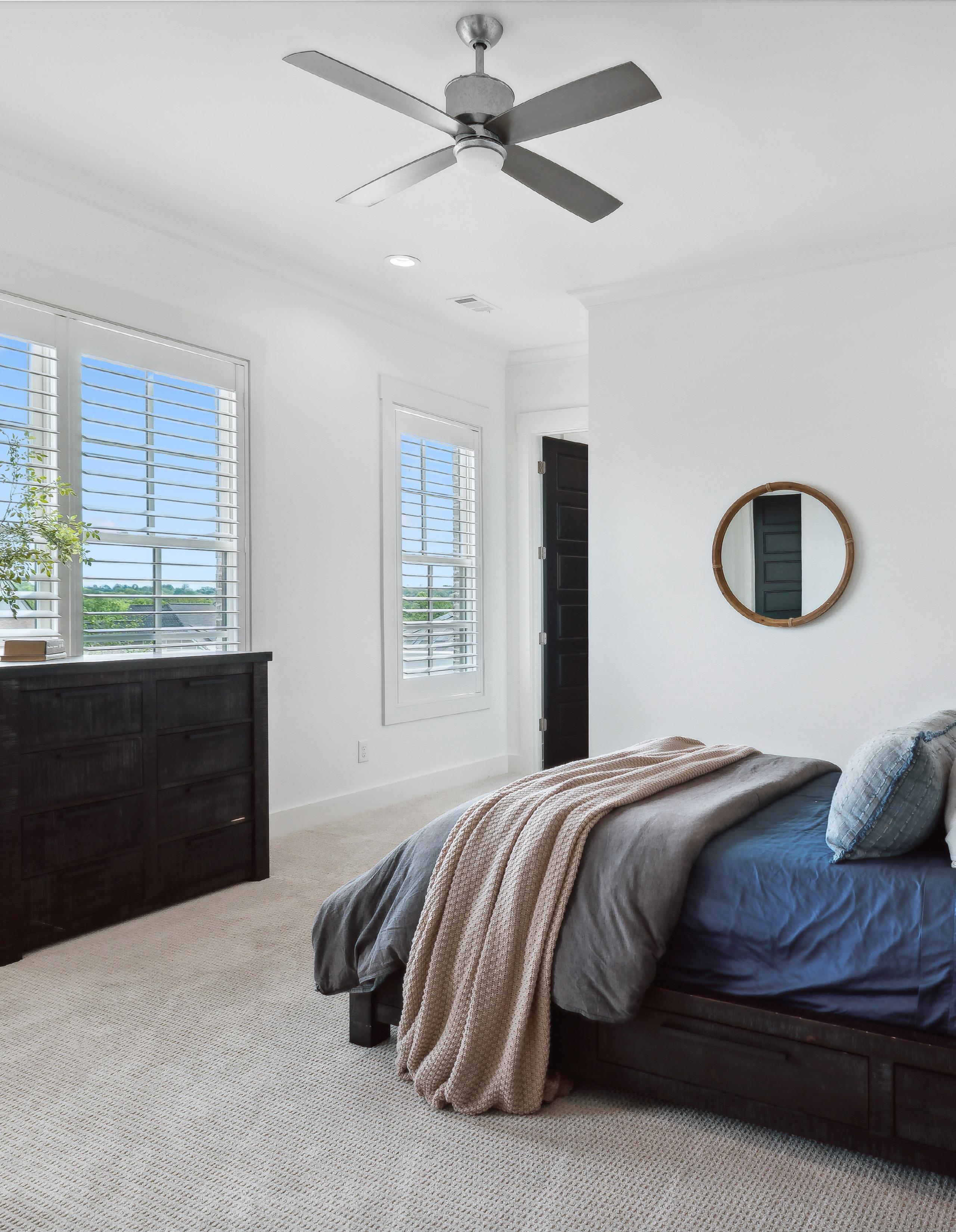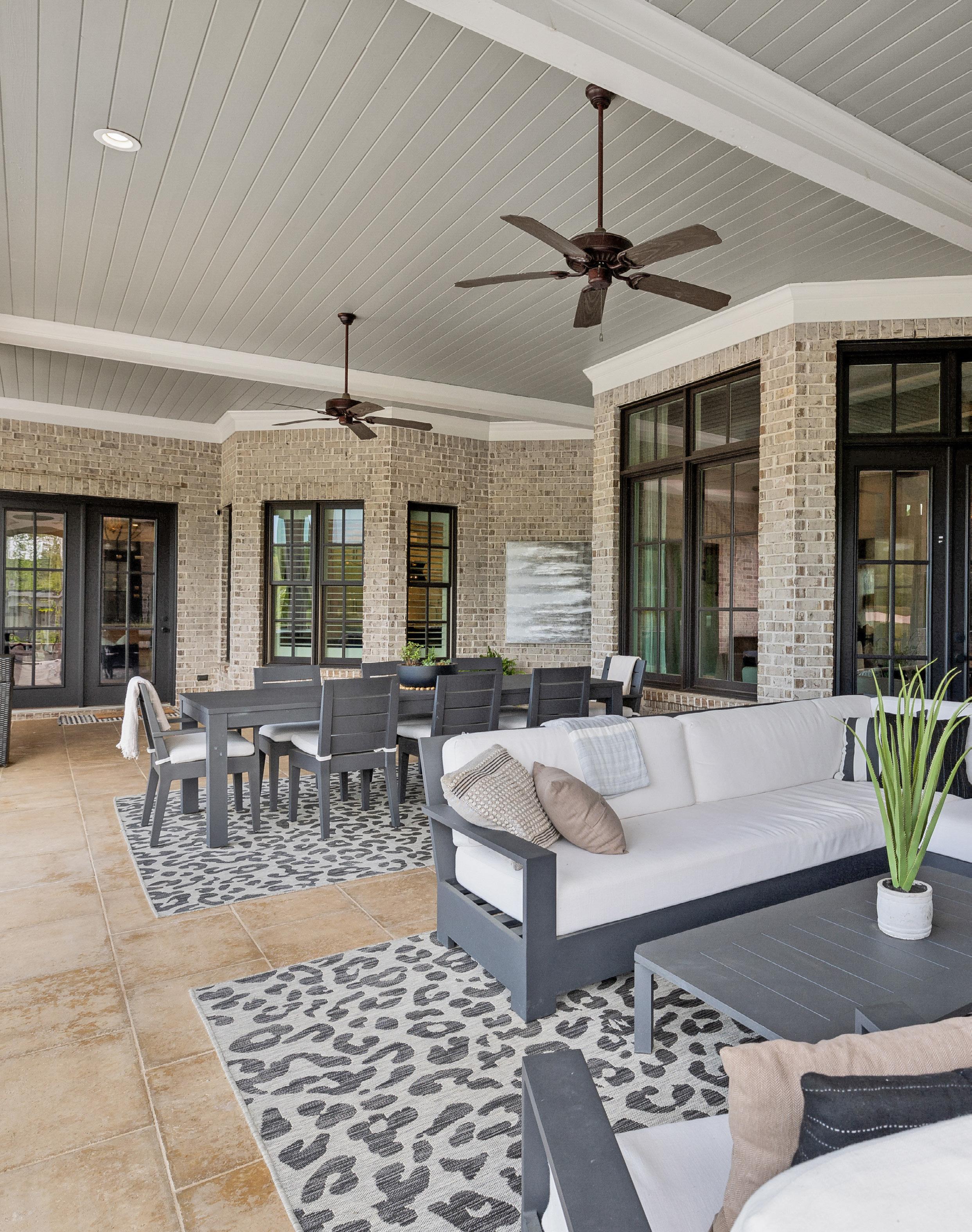 Upstairs offers a fourth bedroom with a bath, a bonus office, and a large rec room with a wet bar that opens to a private balcony with a hanging daybed overlooking the backyard and golf course.