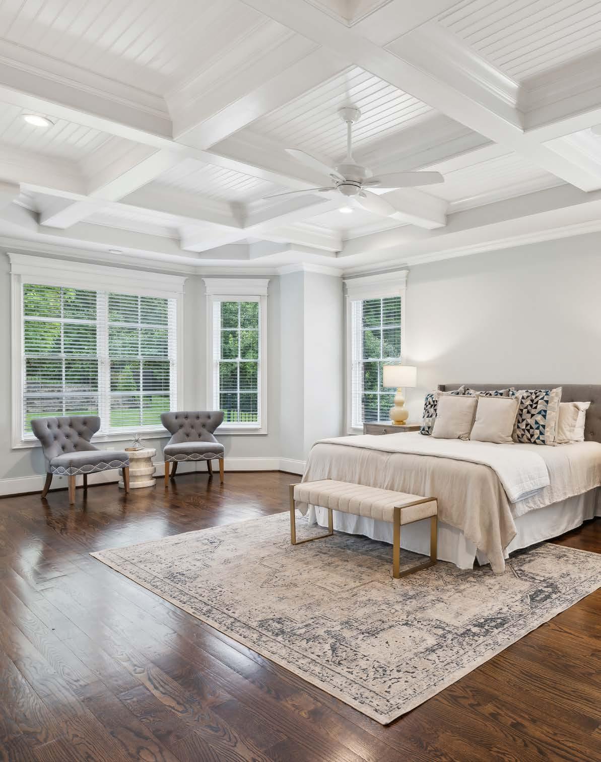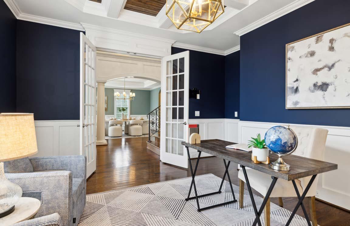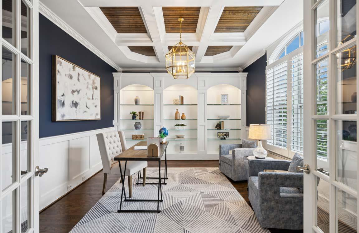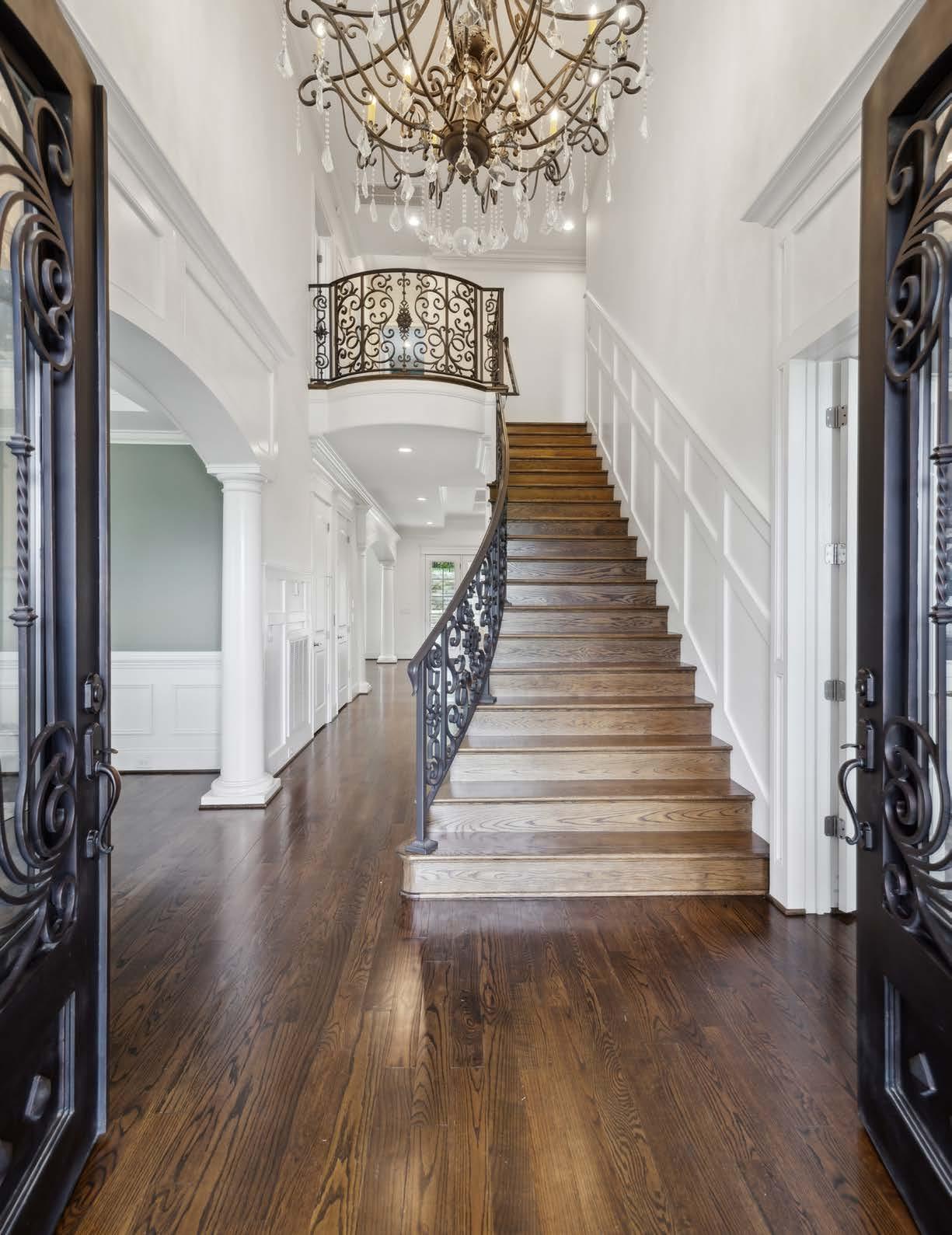 Tucked inside the prestigious gated enclave of Hampton Reserve, this impeccably crafted estate offers timeless elegance and thoughtful design. Custom iron doors welcome you to a grand staircase with wrought iron railings, soaring coffered ceilings, and exquisite millwork, setting the tone for refined living. Gleaming hardwood floors flow throughout, leading to a chef-caliber kitchen with a butler’s pantry, wine bar, and high-end finishes—ideal for both everyday comfort and elevated entertaining.