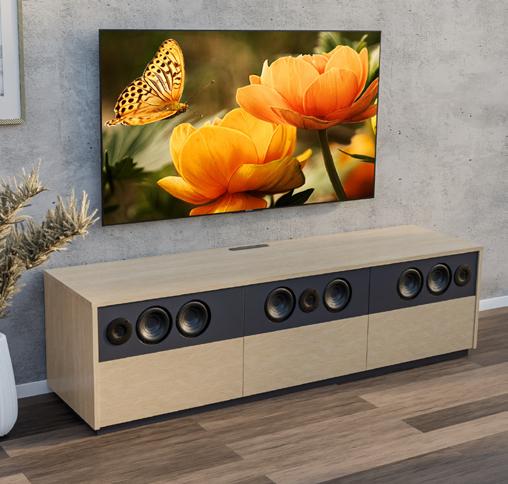 Davon haben die Einrichtungs- und Audio-Spezialisten von Roterring so einige auf Lager. Die neueste Idee der Kreativen Köpfe aus dem Münsterland nennt sich Scaena Protekt Sound PM 3.0. Ein clever konstruiertes und modern gestyltes Audio-Möbel. Eines, das ab Werk gleich mit drei integrierten Passiv-Lautsprechern von Nubert geliefert wird. Dieses Schallwandler-Trio ist millimetergenau in das Möbel eingelassen – selbstverständlich entsprechend seiner Bestimmung als linker Front-, Center und rechter Frontlautsprecher. Dabei handelt es sich um massive Zwei-Wege-Systeme mit jeweils zwei 150 Millimeter durchmessenden Tiefmitteltönern und einem 26-Millimeter Hochtöner mit Seidenge webekalotte. Letzterer sitzt im Center selbstverständlich mittig und in den beiden nebenan befind lichen Lautsprechern aussen neben dem Tiefmitteltöner-Duo. Um die Technik vollständig aus dem Blickfeld verschwinden zu lassen, wird jeder Lautsprecher von einer infrarotdurchlässigen, magnetisch haftenden Akustikblende verdeckt.