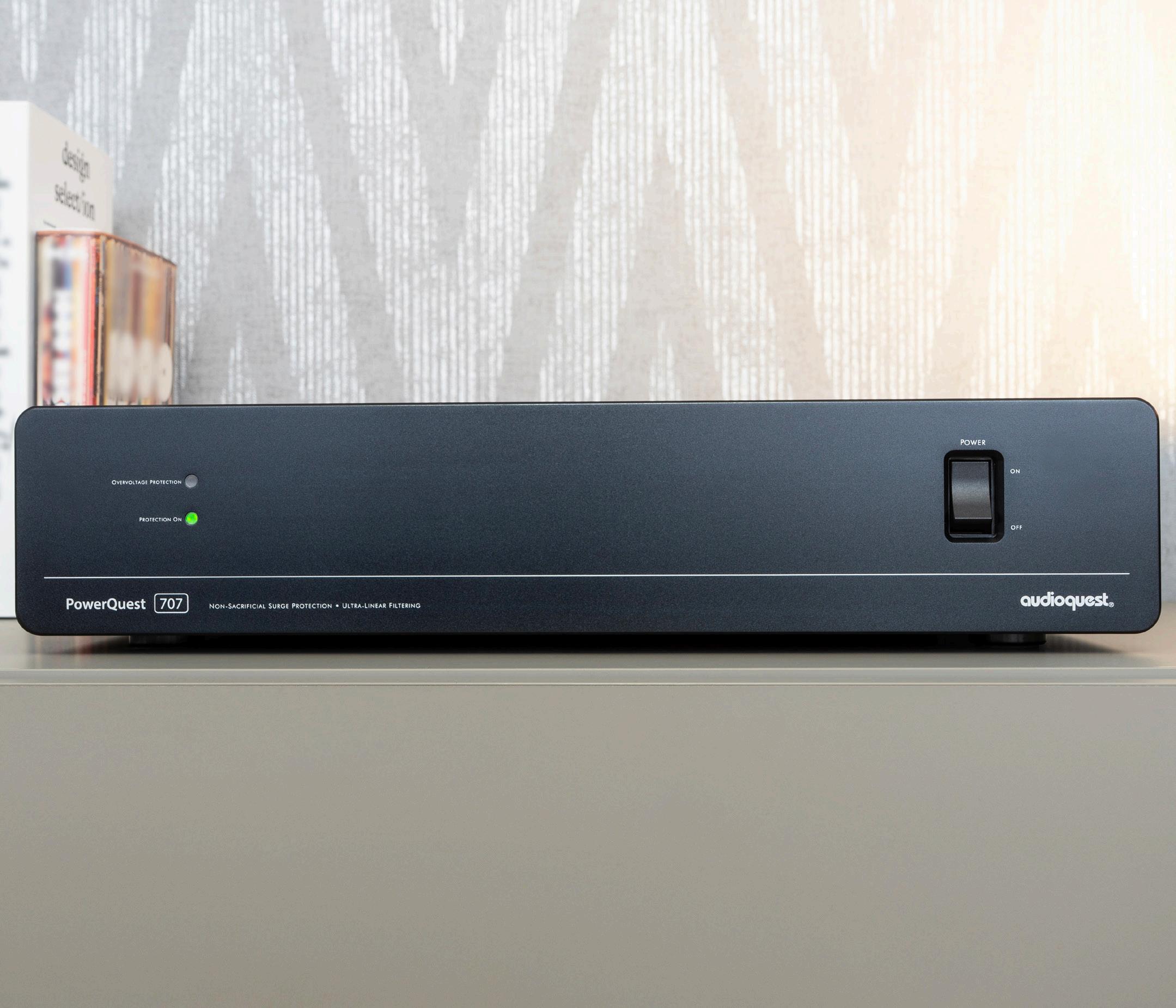 Der AudioQuest PowerQuest 707 punktet als wirkungsvoller Power Conditioner. Er bietet reinen Strom für sieben Komponenten mit getrennter und verschieden ausgelegter Filterung für vier Quellgeräte sowie drei Verstärker. Für sie hat der 707 sogar einen eigenen Energiepuffe in petto, um kurzfristige Leistungsspitzen abzufedern zu können. Von dieser Stromoptimierung profitiert die Performance in allen Disziplinen: Rauschen und Störgeräusche sind reduziert. Die Musik klingt klarer, sauberer, transparenter. Die Auflösung und damit auch der Detailreichtum sind größer. Musiker und Instrumente haben eine stärkere Körperhaftigkeit und Gegenwärtigkeit. Die Abbildung gewinnt an Räumlichkeit und Offenheit, ist akkurater, stimmiger, entspannter – und dank deutlich gesteigerter Dynamik zugleich frischer, Attack-reicher, explosiver und bis runter zum deutlich voluminöseren Bass auch druckvoller. Über diese deutliche Steigerung der Klangqualität hinaus bietet der 707 nun noch einen Überspannungsund Überlastungsschutz für alle angeschlossenen Geräte.