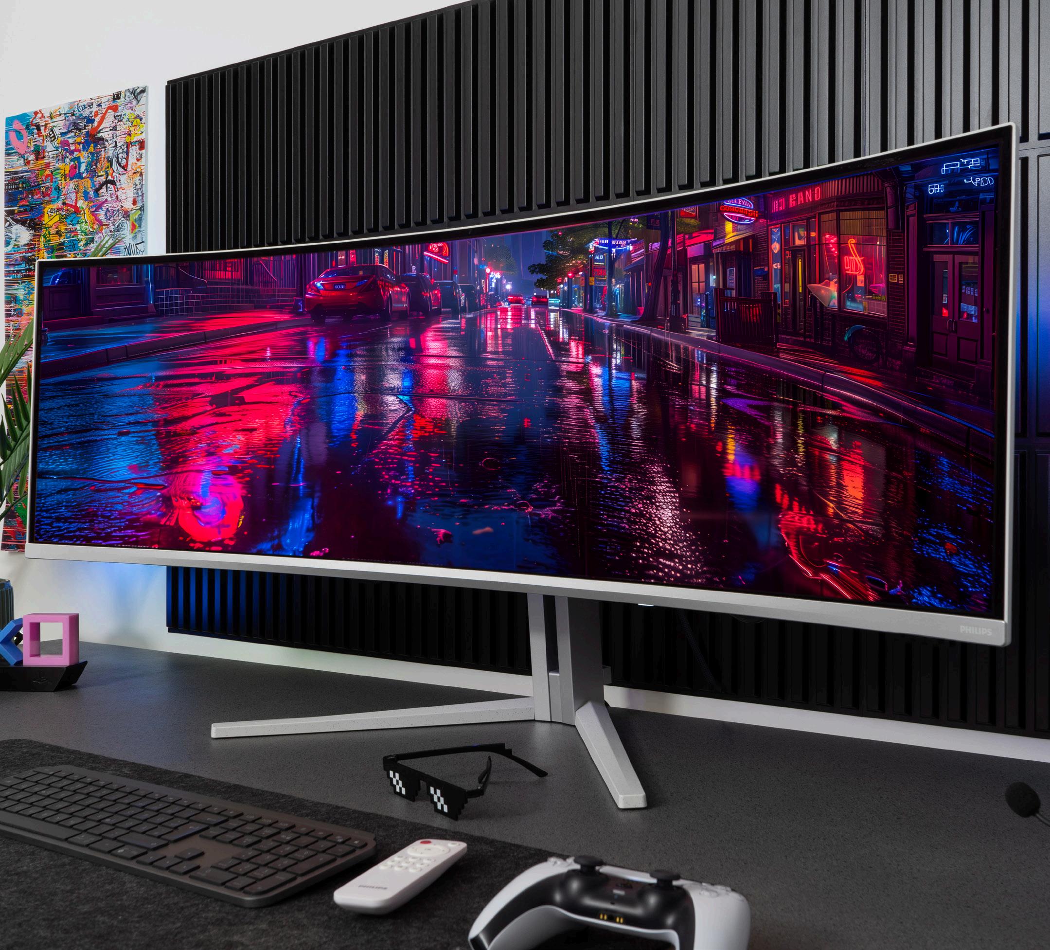 Mit dem Evnia 49M2C8900L hat Philips einen ausgezeichneten Monitor für immersives Gaming im Programm. Das QD OLED Panel des Ultrawide Monitors liefert satte Farben mit tollem Kontrast, tiefdunkles Schwarz mit toller Farbabstufung und eine flüssige, detaillierte Darstellung mit bis zu 144 Hertz und doppelter QHD-Auflösung. Dazu ist der 49-Zöller umfangreich ausgestattet, unterstützt die gleichzeitige Verwendung von zwei Quellen und bietet außerdem erfreulich guten Sound. Letztlich sorgt das Ambiglow dann für atmosphärische Illumination, auch wenn die Funktion kein absoluter Gamechanger ist. Wer sich ein wenig im Handel umschaut, erhält Philips‘ Gaming-Spezialist dann sogar deutlich unter UVP. Damit ist der Evnia 49M2C8900L eine klare Empfehlung für anspruchsvolle Nutzer, die tief in virtuelle Welten abtauchen wollen.