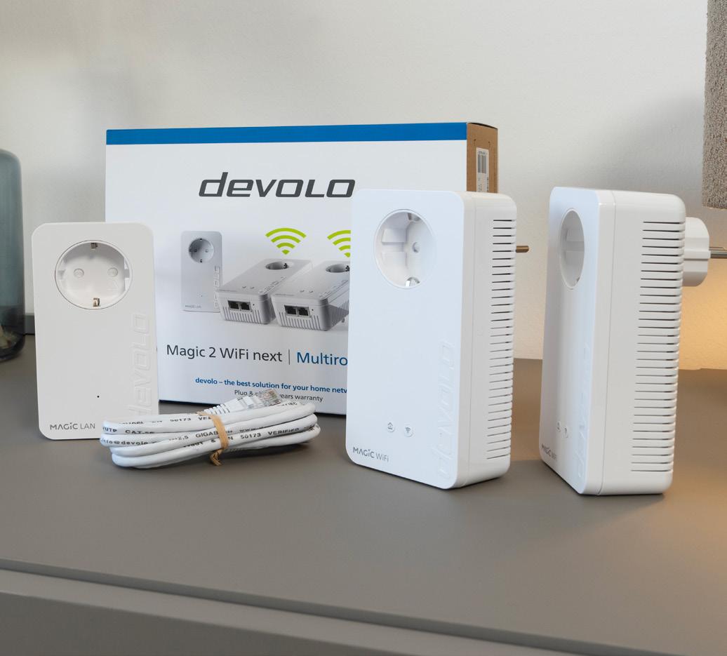 Mit dem Magic 2 WiFi next System hat Devolo ein hervorragendes, benutzerfreundliches System für den einfachen Aufbau eines Heimnetzwerks geschaffen. Die Nutzung des G.hn-Standards sorgt für verlässliche und zukunftssichere Verbindungen, die auch nachträglich eine zusätzliche Erweiterung erlauben. Die verfügbaren Geschwindigkeiten garantieren einen stabilen Durchsatz und schöpfen auch das Potenzial schnellerer Anschlüsse aus. Mit zwei Ethernet-Ports an jedem Adapter können stationäre Geräte außerdem mit voller Bandbreite genutzt werden. Die intelligenten WLAN-Funktionen wie Band-Steering und Airtime Fairness sorgen darüber hinaus für optimale Performance. Einfacher als mit Devolos Magic WiFi 2 next Multiroom Kit dürfte die Versorgung des Heims mit Internet in jeden Winkel kaum möglich sein.