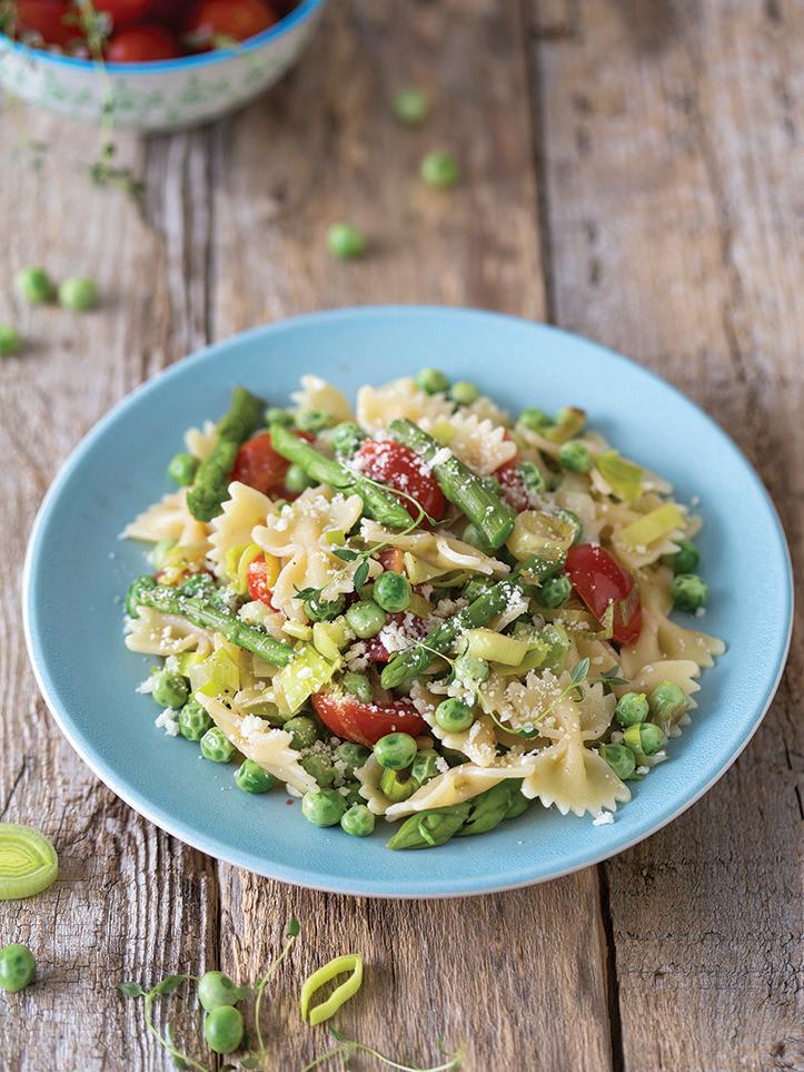 Pasta Primavera with Asparagus, Peas, Leek, and Tomatoes