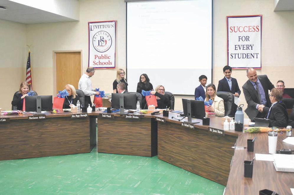School Board Recognition Week is being celebrated this year from Oct. 17–21, so Superintendent Todd Winch, building administrators, students and community members came together at the October board meeting to show their gratitude. Mr. Winch said that the theme in Levittown this year is “positiv ity,” and part of creating a positive cul ture in the district is recognizing those who make meaningful contributions to the schools.