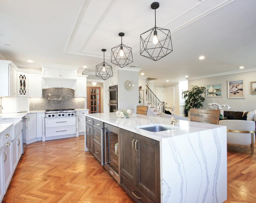 The new kitchen has white cabinetry, Thermador appliances and quartz countertops. The kitchen adjoins the dining room which is open to the living room and bathed in natural light.