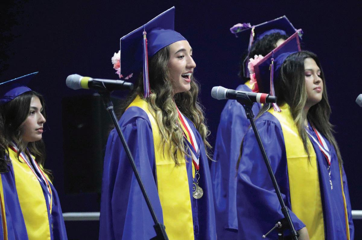 Families packed the bleachers and made their cheers heard as seniors processed to “Pomp and Circumstance” performed by the band under the guidance of Joseph Romano. Class of 2024 President Anastasia Angelakis led the Pledge of Allegiance before senior choir members, led by Lisa Levenberg, sang the national anthem and “Slipping Through My Fingers” by ABBA.