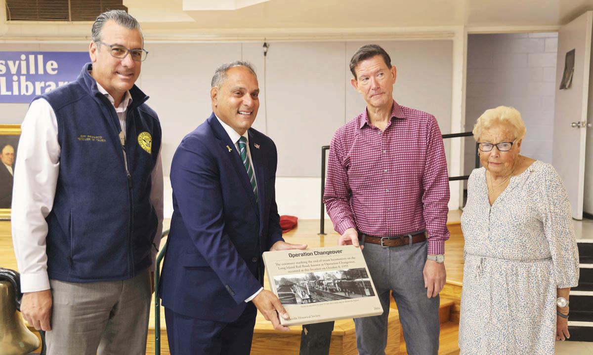 Oyster Bay Town Supervisor Joseph Saladino, along with Receiver of Taxes Jeffrey Pravato and Nassau County Legislator Rose Walker, joined the Hicksville Historical Society to commemorate the 190th anniversary of the Long Island Rail Road. A plaque dedicated to the historic “Operation Changeover,” an event which marked the end of the use of steam engines, was unveiled and will be displayed at Kennedy Park, a location widely considered to be the epicenter of the LIRR. The plaque, donated by the Hicksville Historical Society, will be placed following the expansion and improvement of Kennedy Park which will take place as part of a larger community revitalization project to break ground soon in Downtown Hicksville.