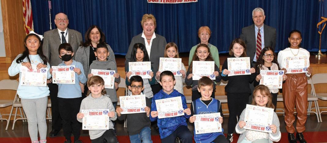 Students and their special guests enjoyed making crafts together. Enjoying a fun event with a special person. Photos courtesy of Hicksville Public Schools Hempstead Town Clerk Kate Murray congratulated Terrific Kids Connor Miller, Ayaan Azeem, Maggie Liu, Myles Tovar, Niko Grupposo, Chole Cen, Alexa Ditta, Liliana Bradley, Kennedy Cain, Lyndsey Aristondo, Luca Perullo, Amisha Doobay, Riain Molloy and Elliette Porembski during the Levittown Kiwanis Terrific Kids Awards Celebration on November 29 at Michael F. Stokes School. Also attending were Jim and Pat Carney of the Levittown Kiwanis, Principal Allison Ackerman and Island Park Schools Superintendent Dr. Charles Murphy.