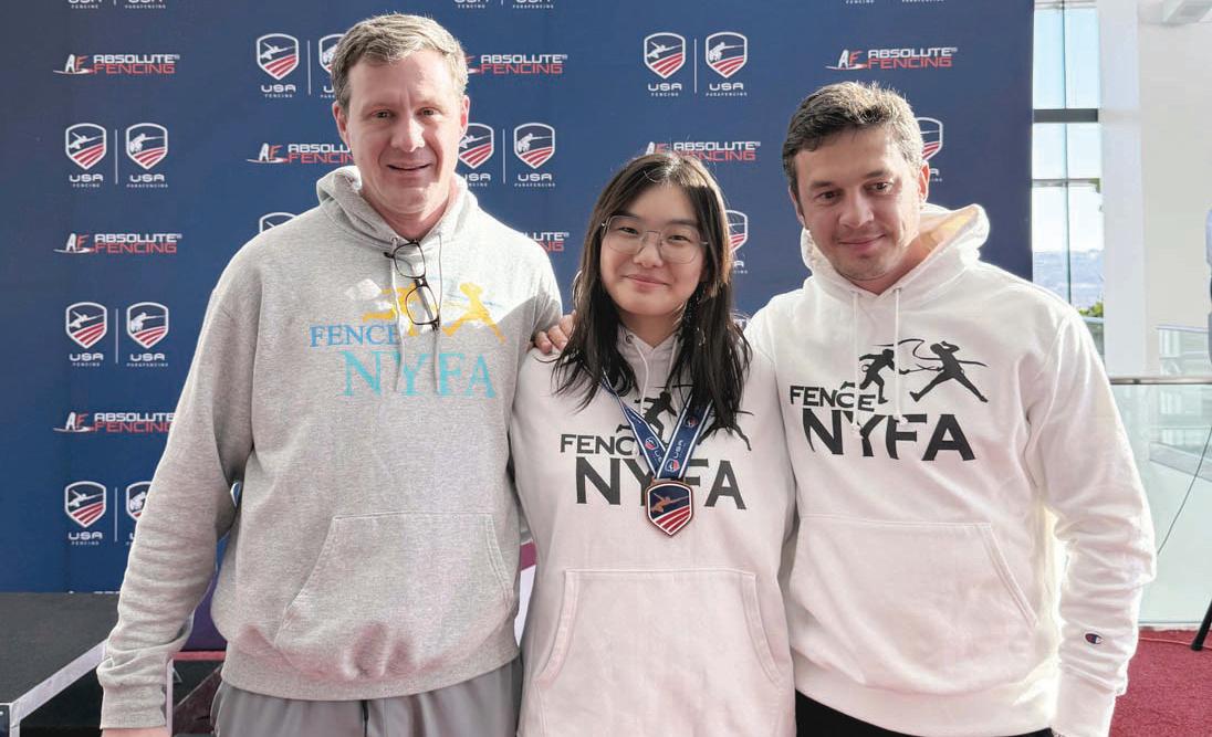 Scarlett Lee (center) with Coaches (L-R) Sergey Danilov, Misha Mokretsov pc NY Fencing Academy.