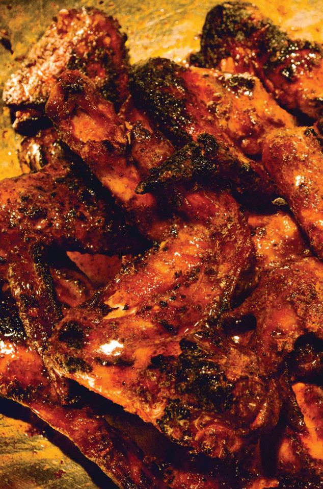 11) Remove the wings from the smoker or grill and put half of them into a bowl, cover with the sauce, and toss. Repeat with the remaining wings and serve on a platter, with the blue cheese dip on the side.