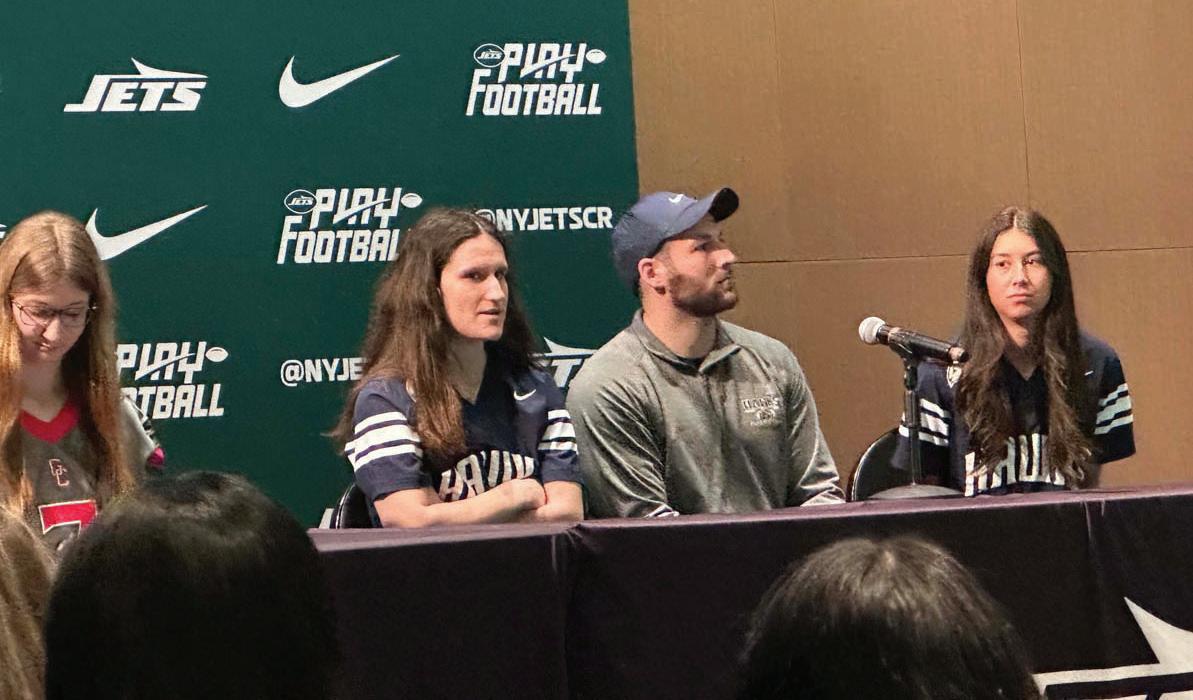 Plainview-Old Bethpage John F. Kennedy High School (POBJFKHS) star flag football players Rachel Ganz and Julia Kesselman, along with coaches Alec Abramowitz and Christine Ho, attended the second annual high school girls flag football media day hosted by the New York Jets at MetLife Stadium in February.