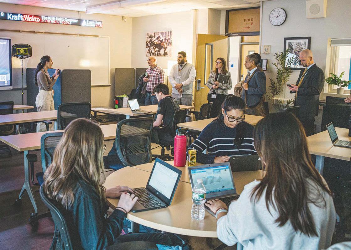 NASTECH members get a tour of the Bethpage High School business hub, complete with ticker, modular furniture and “mood” lighting akin to an office space.