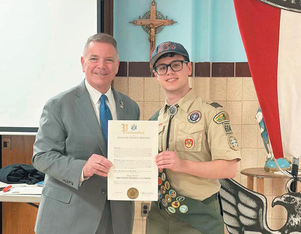 New York State Senator Steve Rhoads with Eagle Scout Matthew Thomas Cusumano