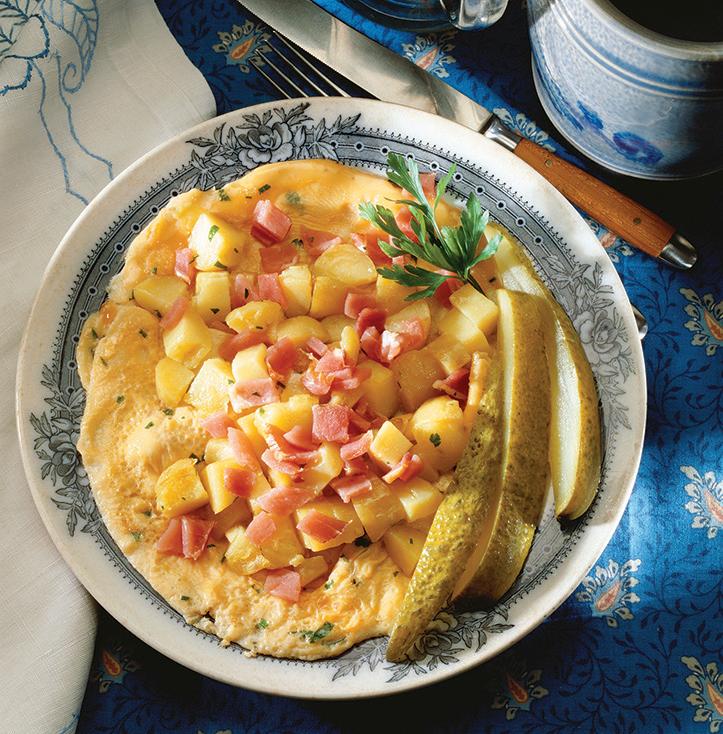 3) Slide cooked omelet onto plate. Season with freshly ground black pepper and top with potato and ham mixture. Garnish with fresh parsley and sliced pickle. Serve immediately.o juices have time to thicken, from 1 to 2 hours.
