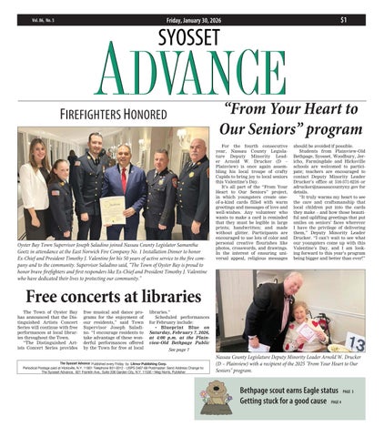 Syosset Library is located at 225 South Oyster Bay Road in Syosset. For more information about programs, services, and hours, call 516-921-7161, or visit the library or the website at www. syossetlibrary.org.