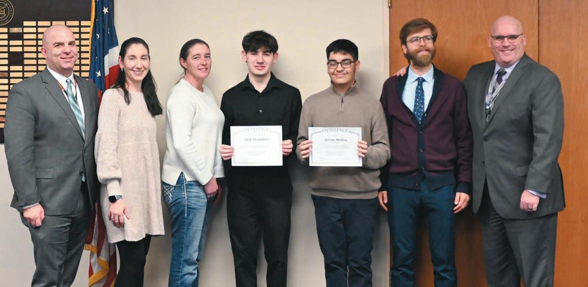 The final group of student recognitions included Jack Beaudette Mayuri Kumar, Patrick LaBarca, Saivamsi Nanugonda and Rohan Shah representing the high school’s Virtual Enterprise (VE) program that has won recent local Trade Shows and Business Plan Competitions showcasing their virtual company Bello, a hair care subscription package, advancing them to Nationals taking place in April at the Jacob Javitz Center in New York City.