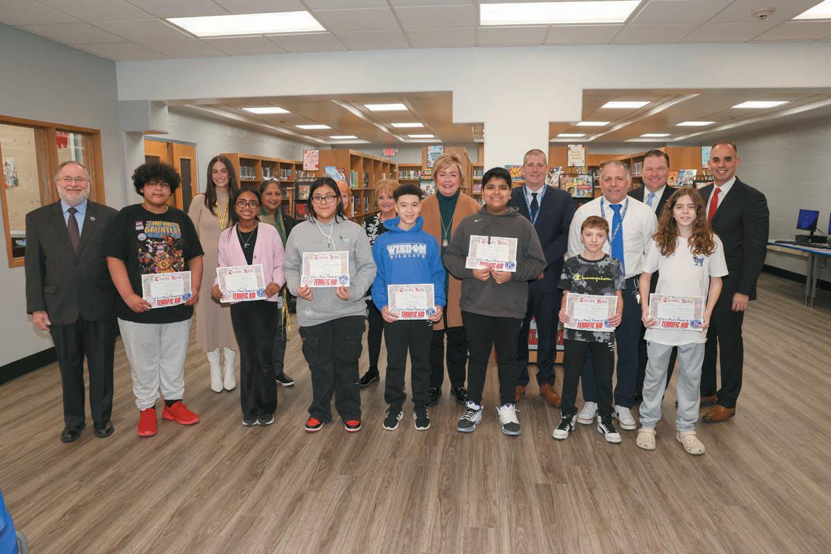 Town Clerk Kate Murray congratulated Wisdom Lane Middle School students Rayquon Eisner-Perry, Sariah Evans, Dominic Grauso, Belkiz Mamum, Zebastian Melendez, Matthew Petrelli and Mahtab Singh as they were named “Terrific Kids” by the Levittown Kiwanis Club. Also attending were Levittown Kiwanians Phyllis Camillone, Pat Carney and Diane Mortagua; Levittown Kiwanis Advisor Scott Hass; Superintendent of Schools Todd Winch; Principal John Avena; Assistant Principal Craig Arvelo-Shaw; and Nassau County Legislator Tom McKevitt.