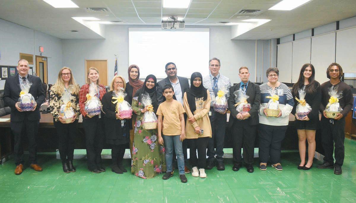 The Levittown Board of Education honored Division Avenue High School salutatorian Ceyda Nazli (fifth from left) and valedictorian Syeda Nowroz at its April 16 meeting.