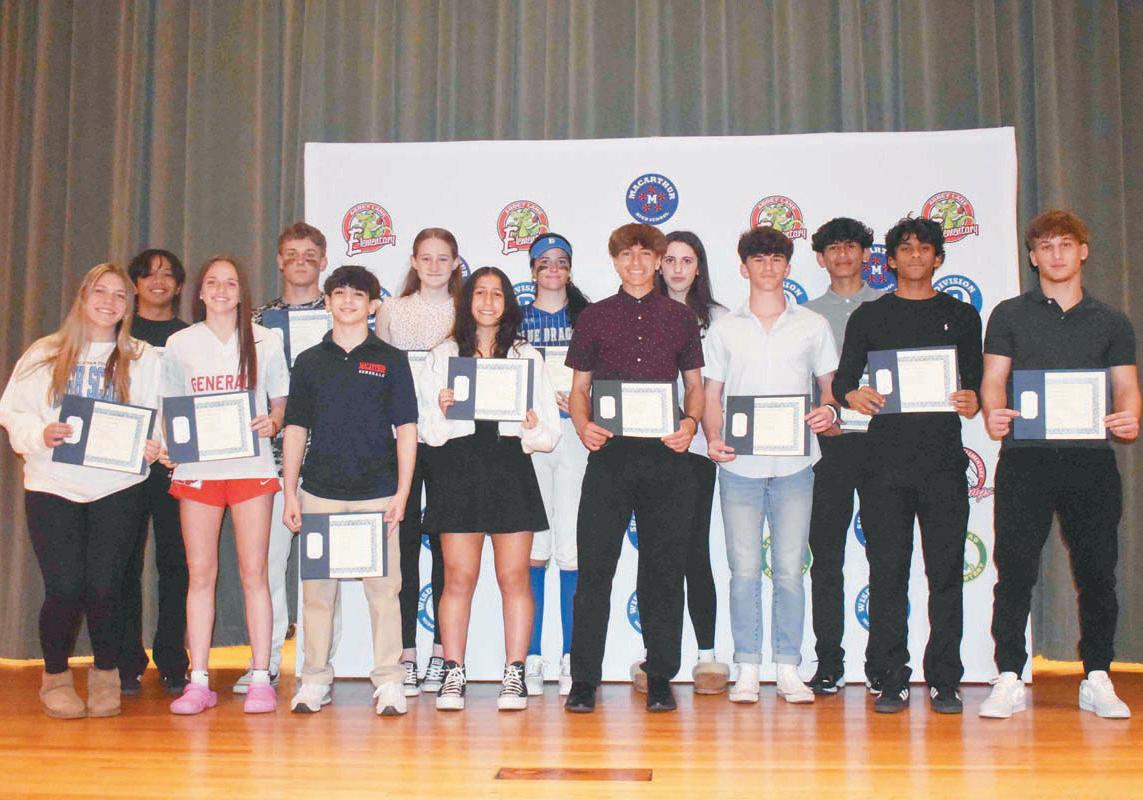 and Board of Education members presented each student with a plaque to honor this significant achievement. Varsity athletes from Division Avenue and MacArthur High Schools were also recognized for their various accomplishments during the winter season. Students from basketball, cheerleading, swimming, wrestling and winter tracks teams were called up for their various accolades, including All-County selections, Player of the Year awards,