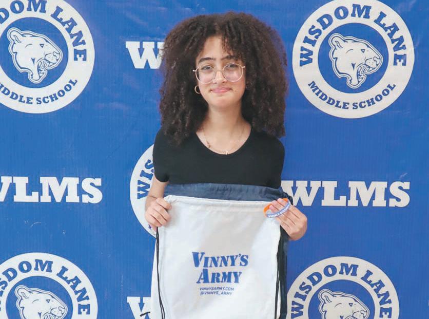 Abigail is the president of Wisdom Lane’s National Junior Honor Society chapter, for which she has helped organize numerous philanthropic endeavors. Recently, the group worked with the foundation Vinny’s Army, which helps children battling cancer. To benefit the foundation, Abigail led two successful fundraising events: a crazy hat day during which students brought in $1 to wear a hat of their choice, and