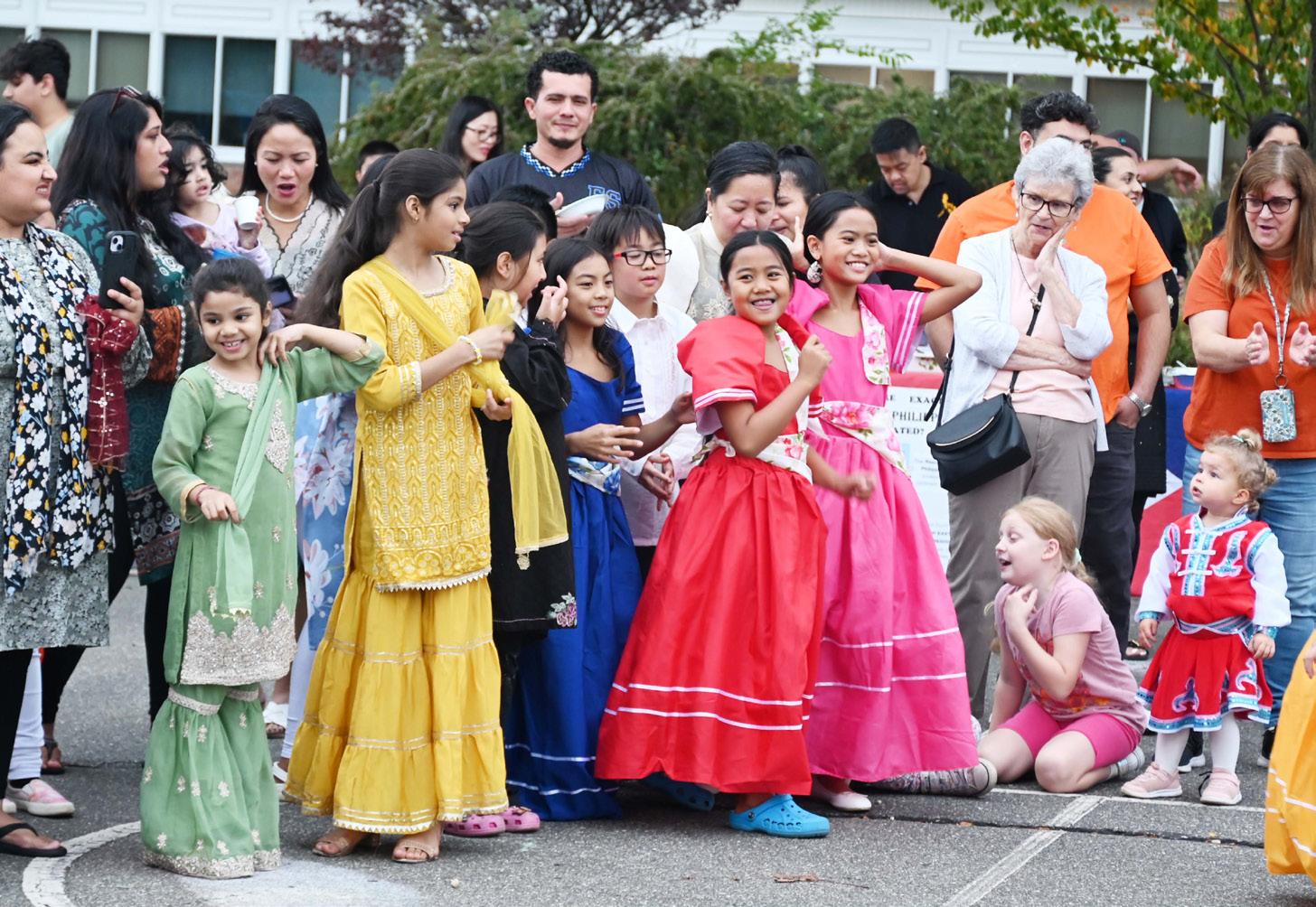 Attendees were invited to stroll from table to table to learn about different cultures and taste different foods. Guests explored customs, listened to music and enjoyed food throughout the event. Several students wore colorful clothes and performed traditional dances reflect -
