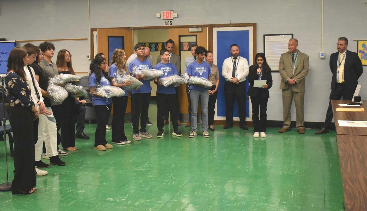 Members of the National Junior Honor Society at Jonas Salk Middle School and eighth grade officers from Wisdom Lane Middle School gifted each trustee a rain jacket. Senior class officers from Division Avenue and MacArthur High Schools presented them with blankets. Seniors Vidhi Patel from Division and Thomas Bennett from MacArthur also shared their appreciation for the board’s