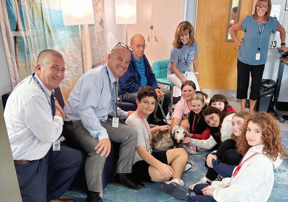 Comfort dog Argus, a senior greyhound, has brought smiles and calm to students and staff at Jonas E. Salk and Wisdom Lane Middle Schools and Division Avenue and General Douglas