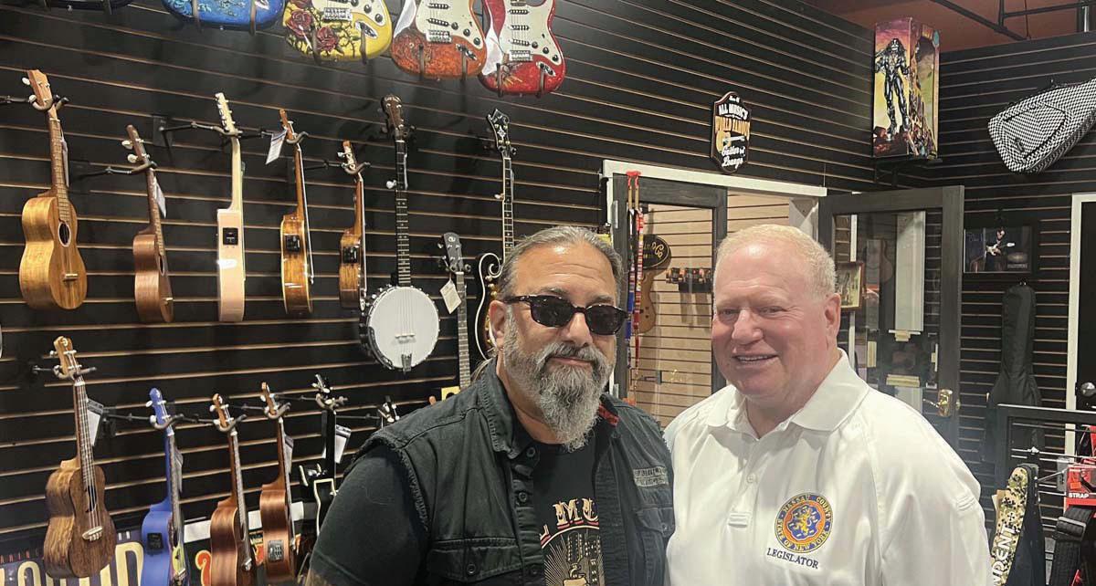 Guy Brogna, owner of All Music in Plainview, with Nassau County Legislature Deputy Minority Leader Arnold W. Drucker.