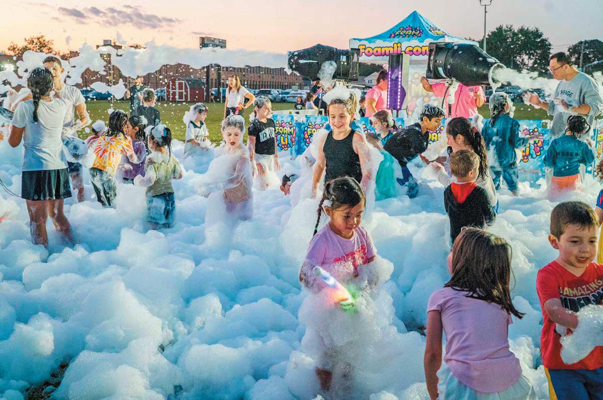 families spread out at tables to eat and catch up. Younger students darted between face painting, karaoke and the night’s biggest draw — Foam Long Island. Two giant cannons blasted out mountains of suds, and before long a sea of kids (and a few adventurous parents) were happily soaked.