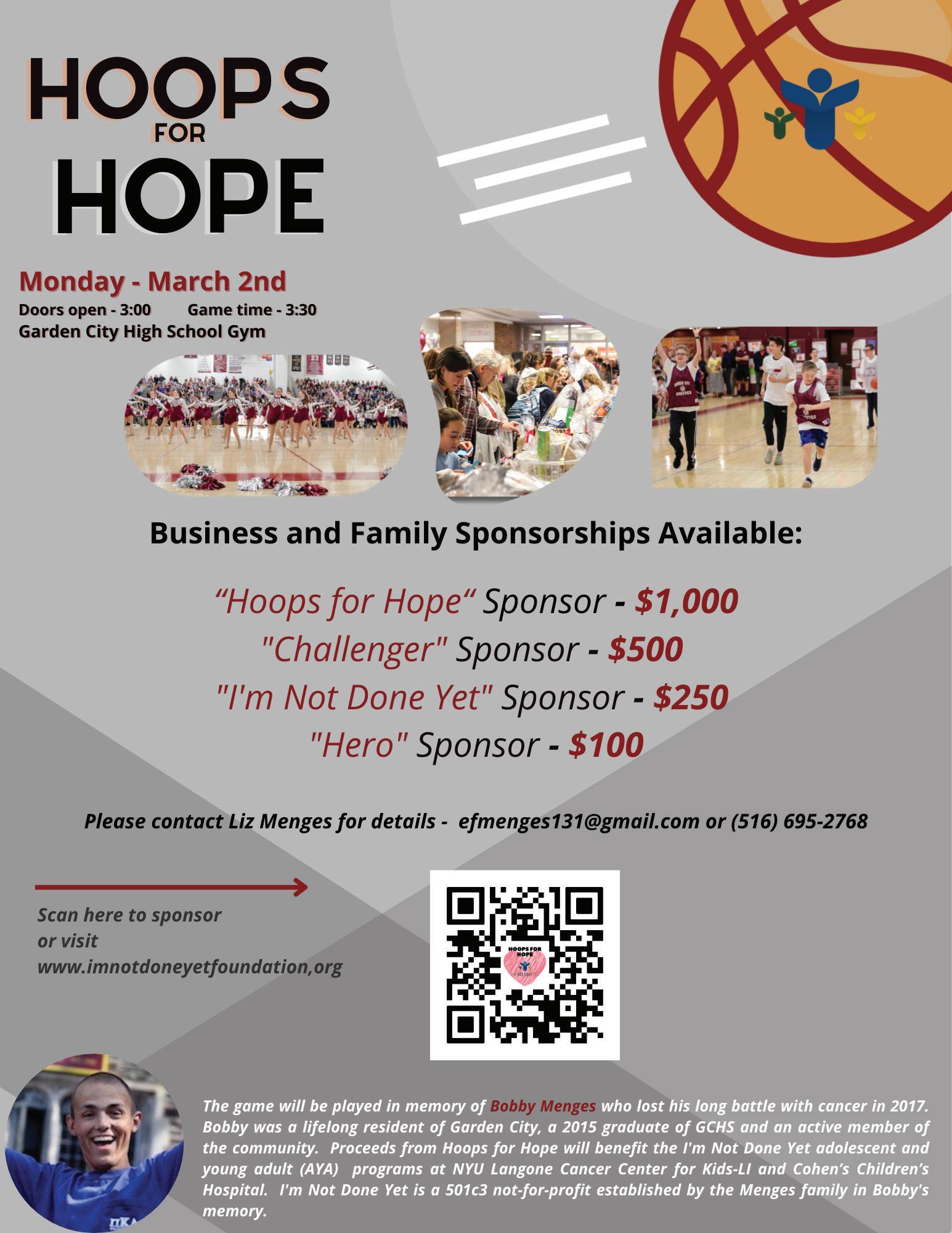 Mark your calendars! Hoops for Hope is coming in March! Come cheer the Challengers on Monday, March 2, at Garden City High School. Doors open at 3 and tip off is at 3:30. The game is being played in memory of Bobby Menges, a GCHS alum who lost his battle with cancer. All proceeds from the game will be donated to the I’m Not Done Yet Foundation. INDY’s mission is to help adolescent and young adult patients who are fighting cancer and other serious, chronic and long-term illnesses.